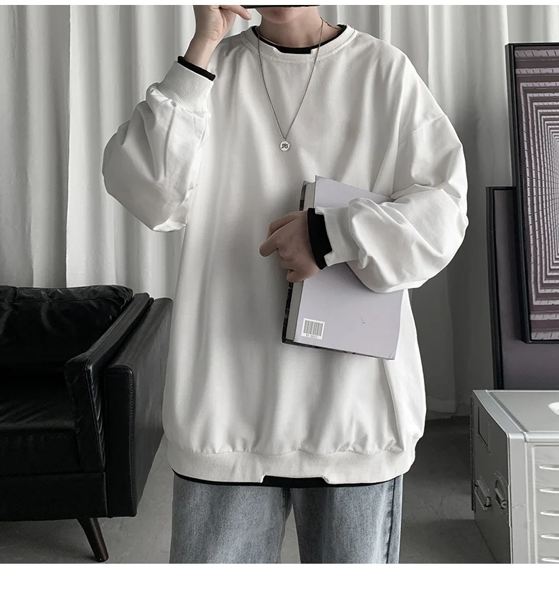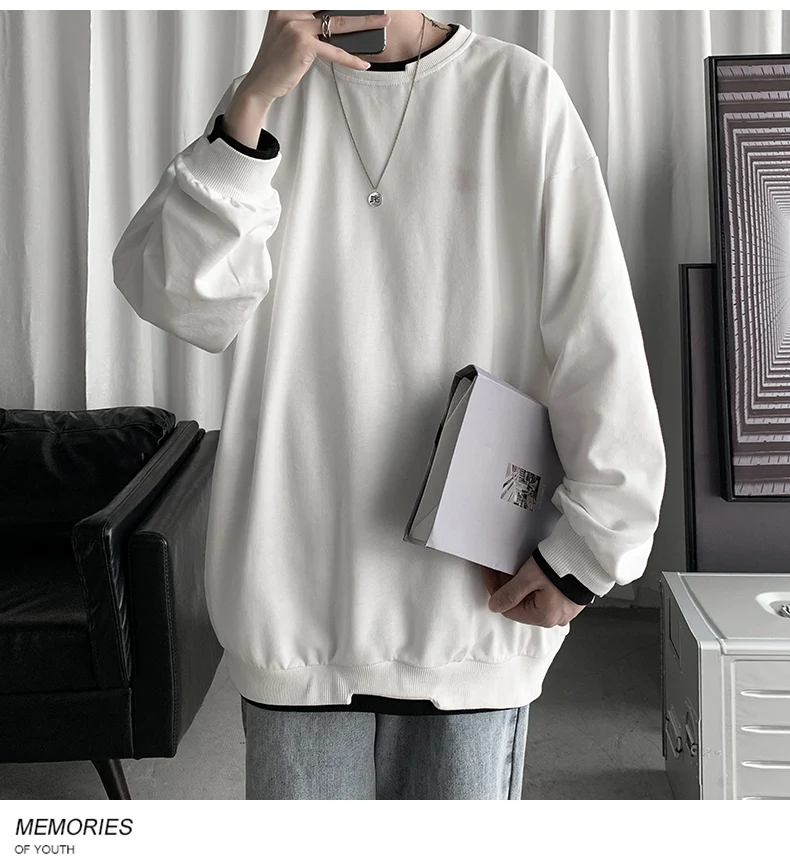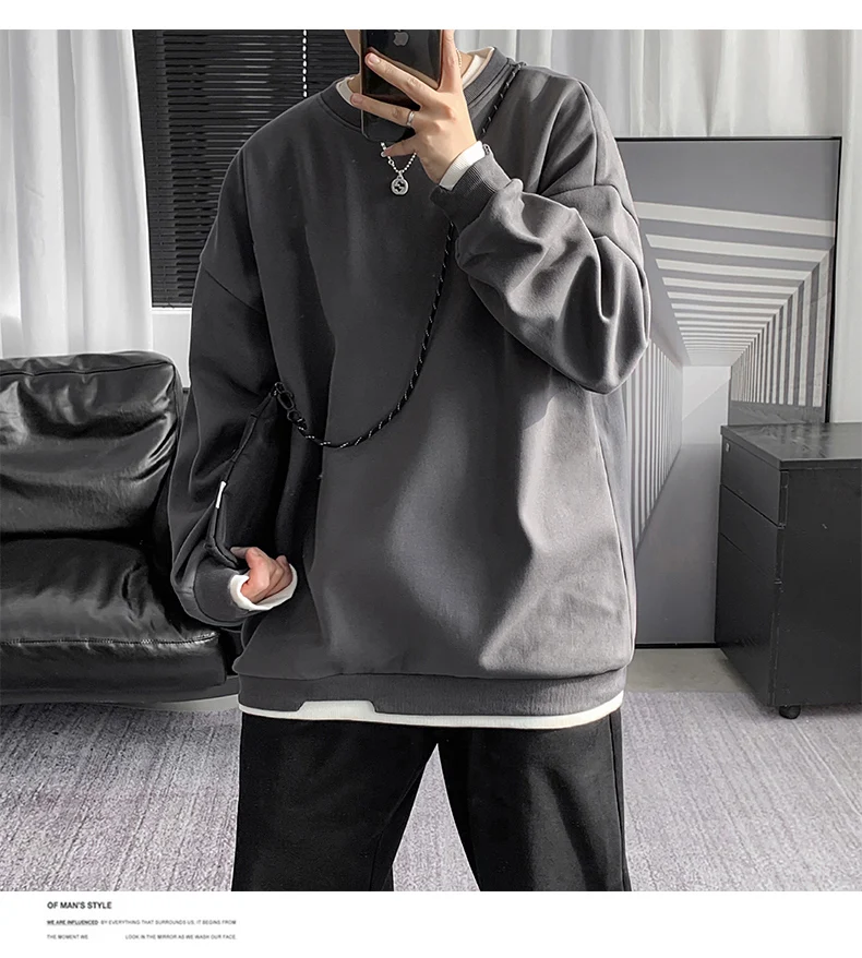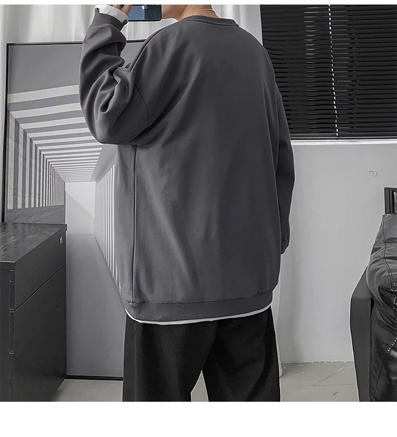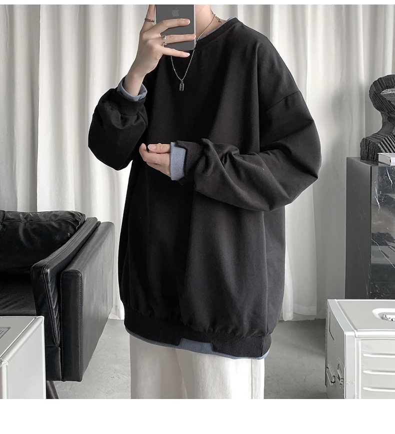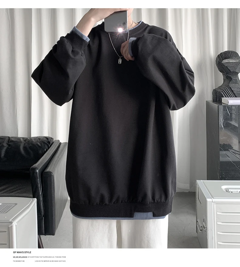 Threebooy Mens Casual Sweatshirts Hoodie Men Fake Two Pieces Oversized Japanese Streetwear Sweatshirts Man Harajuku O-Neck Hoodie