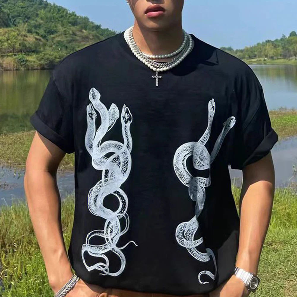 Threebooy Men's Casual T-Shirt Fashionable Trendy Hip-Hop High Street Y2k Retro Snake Pattern Loose Cotton Top 2024 Spring And Summer