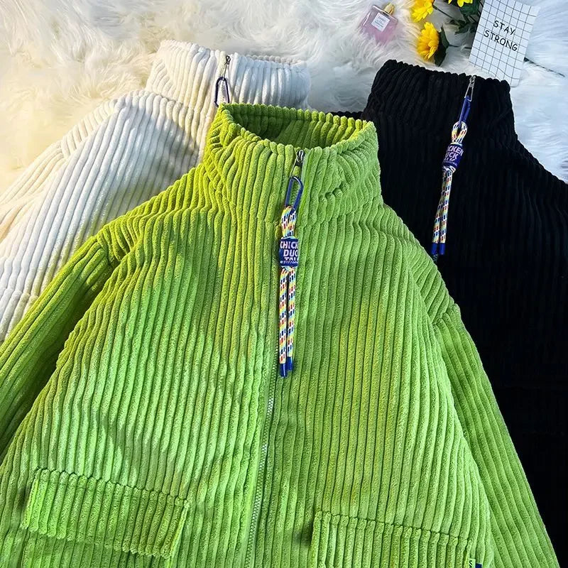 Threebooy Men's Cotton Padded Jacket Winter Corduroy Padded Jackets Female Loose Stand-up Collar Thickened Warm Zipper Solid Color Coats
