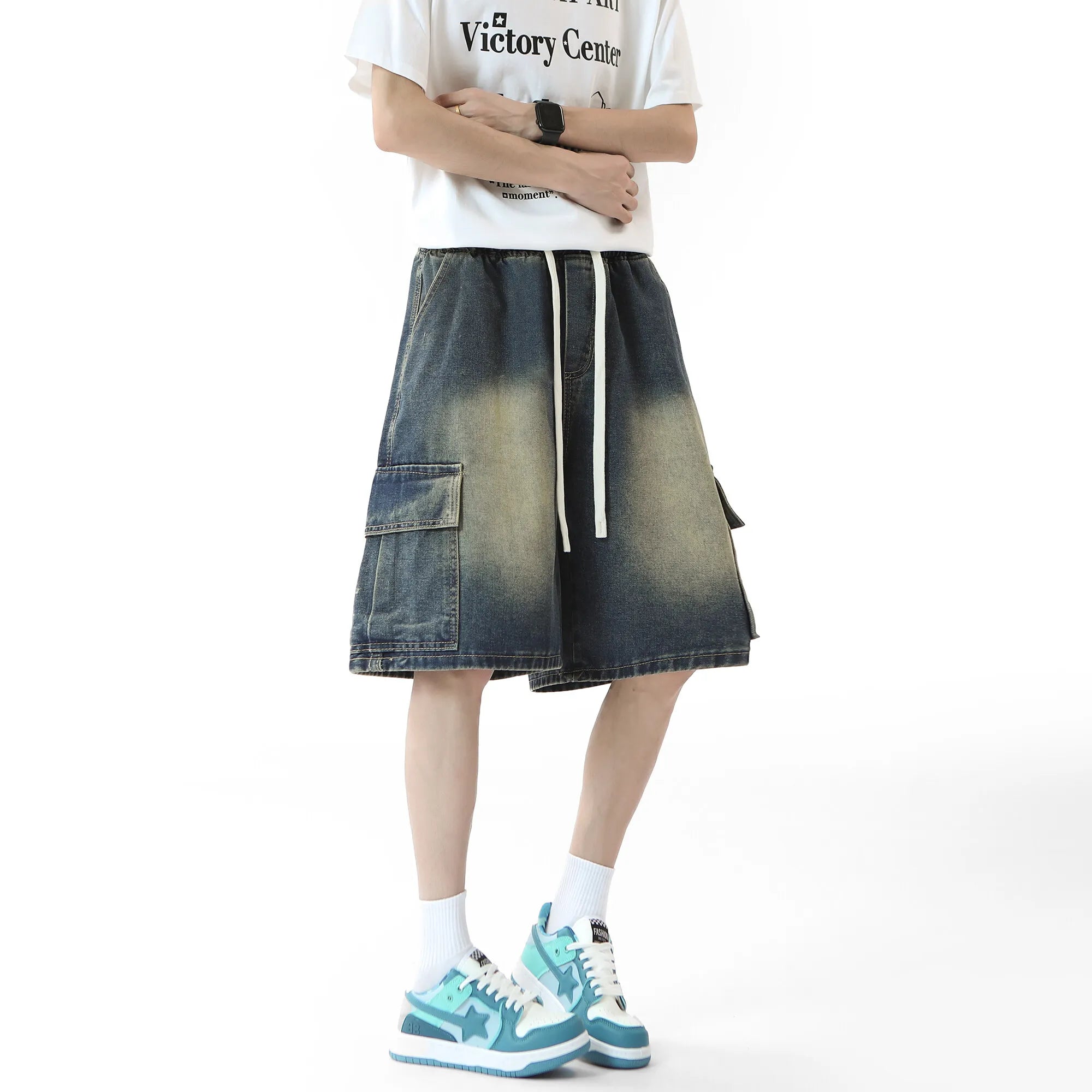 Threebooy Mens Denim Shorts Washed Cargo Drawstring waist Jorts Multi Pocket Workwear Casual Side Large Pockets Stretchy Waistband Outdoor