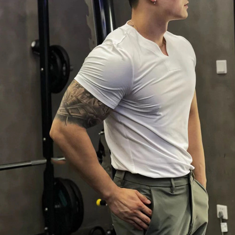 Threebooy Men's Fashion Casual T-Shirt Summer New Solid V-Neck Short Sleeve Top Tight Tee Shirts Muscle Male Workout Sexy T-Shirt LGBT Pri