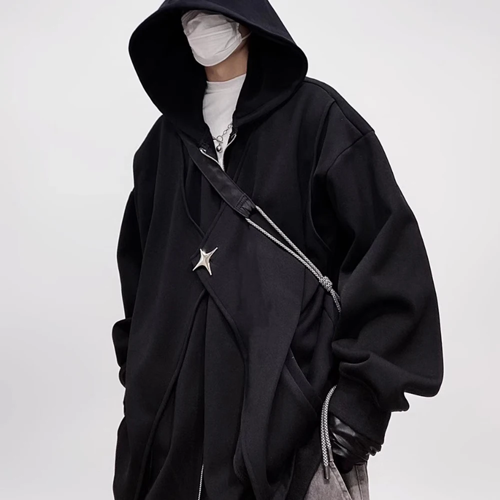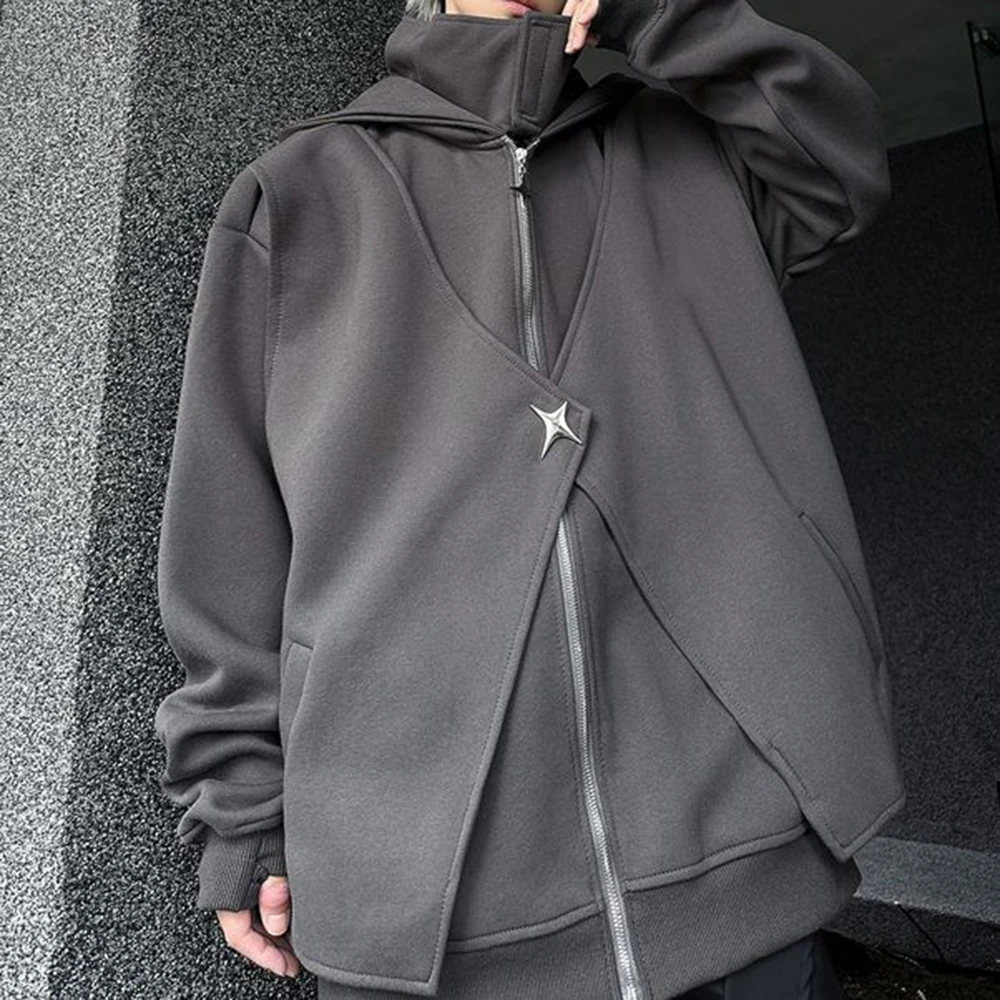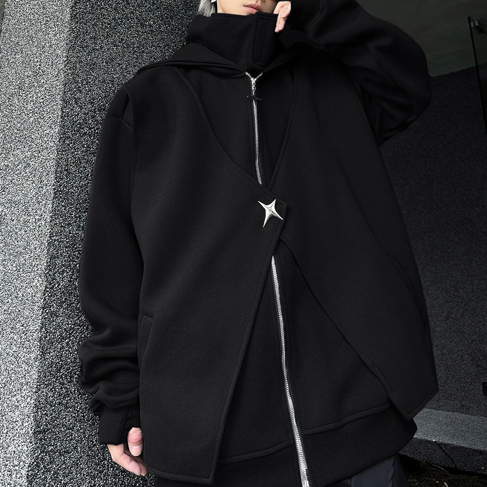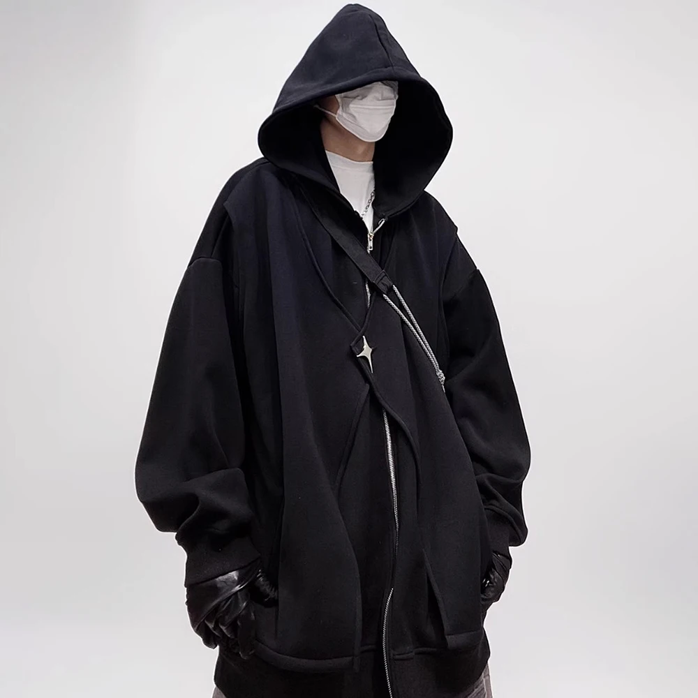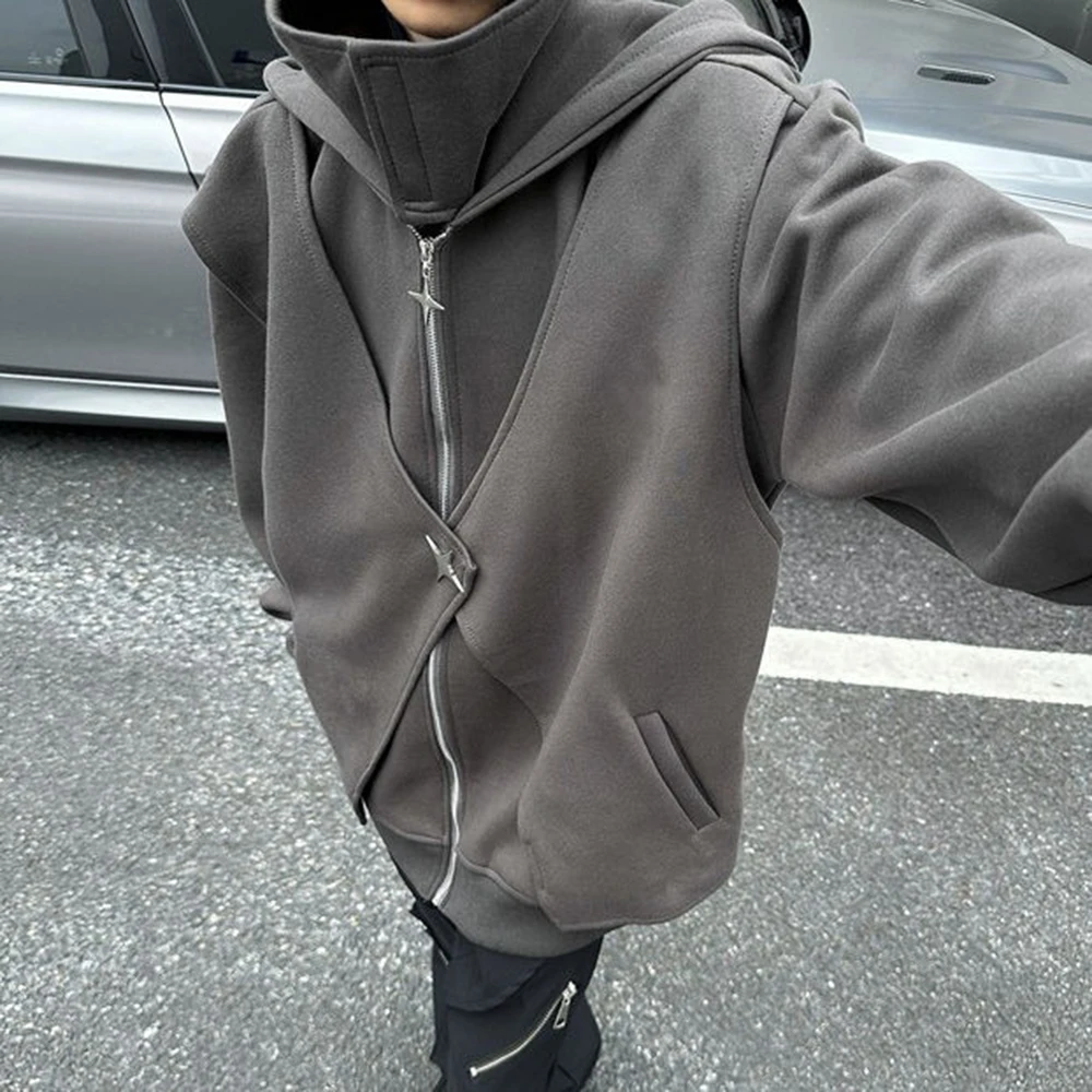 Threebooy Mens Fashion Y2k Fake Two-Piece Cardigan Sweatshirt Autumn Winter High Street American Style Heavy Trend Functional Jacket Men