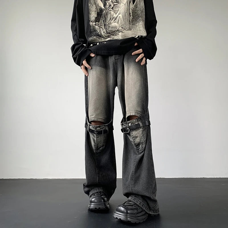 Threebooy Men's Jeans Retro Trousers Knee Holes Splicing High Street Loose Denim Trousers Flared Jeans Straps Cowboy Casual Long Pants
