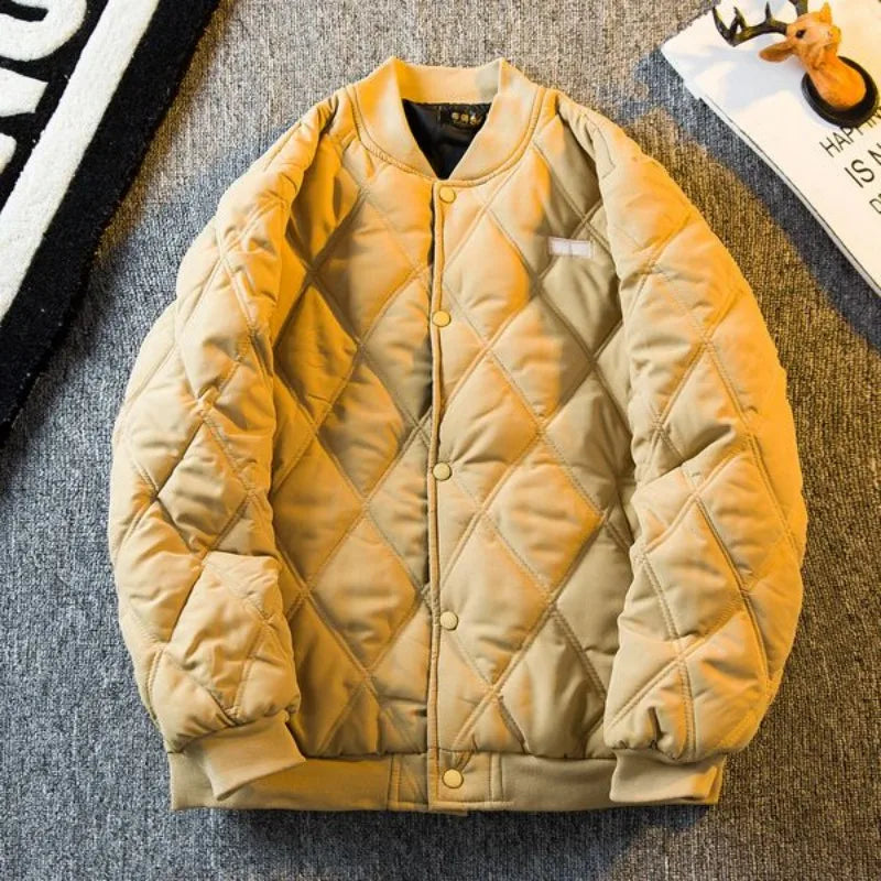 Threebooy Men's Parkas Rhombus Padded Cotton Winter Thickened Retro Casual Baseball Uniforms Warm Coat Stand Collar Single-breasted Coats