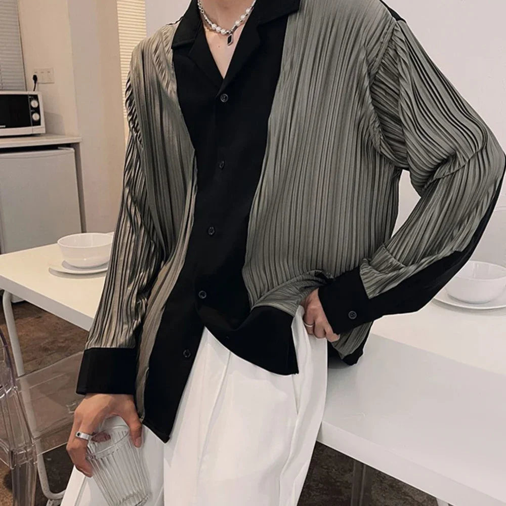 Threebooy Mens Patchwork Contrasting Pleated Long-Sleeved Shirt 2024 New Genderless British Elegant Fashion Retro Loose Shirt Unisex
