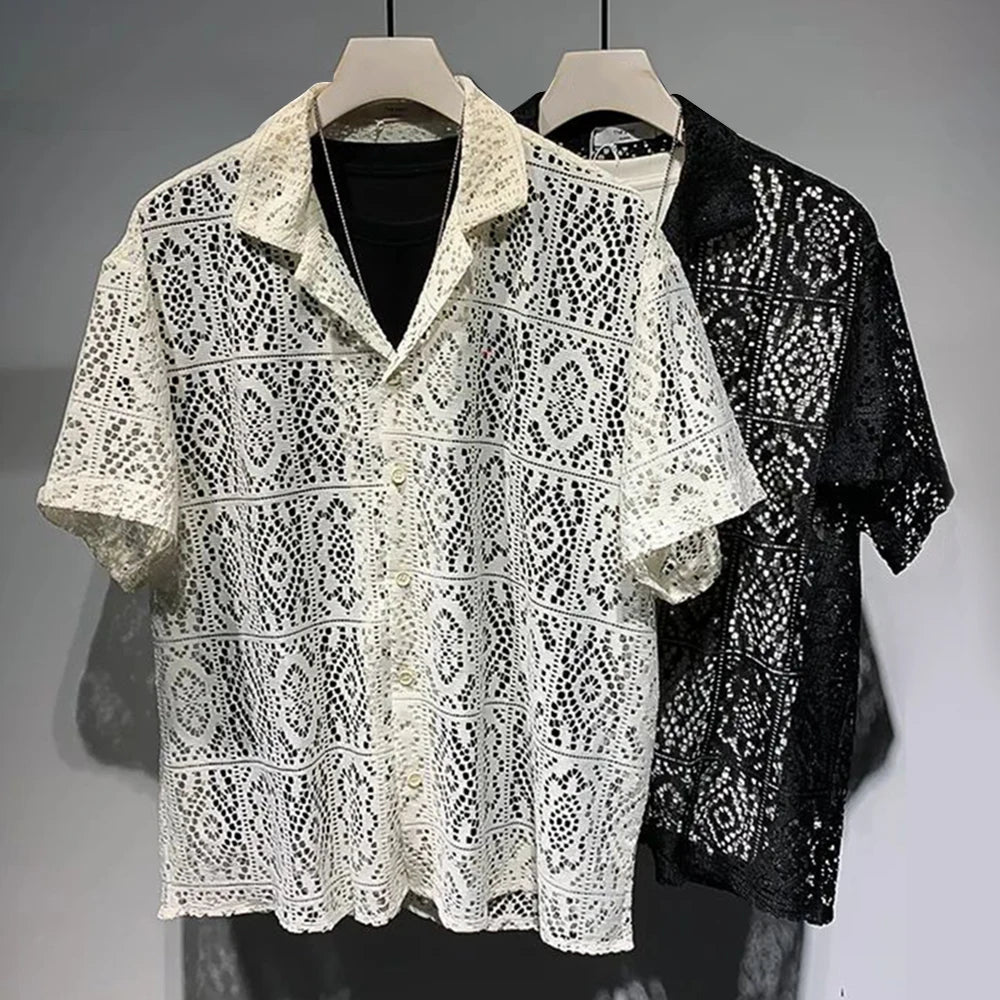 Threebooy Mens See-Through Hollow Short-Sleeve Casual Shirt 2024 New Genderless Fashion Individuality Retro Sexy Lace Loose Shirt Unisex