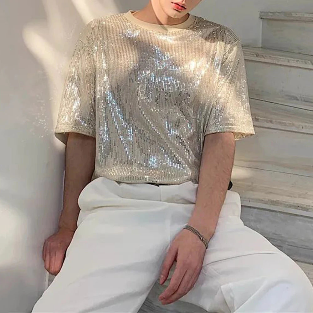 Threebooy Mens sequin casual t-shirt genderless 2024 new fashion nightclub personality versatile performance short-sleeved top unisex