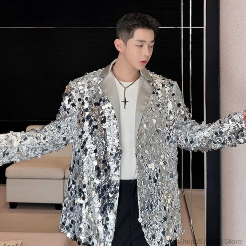 Threebooy Men's Sequins Blazer Glitters Bling Suit Jacket Singer Stage Shiny Clothing Black Silver Oversize Party Suit Coat Man