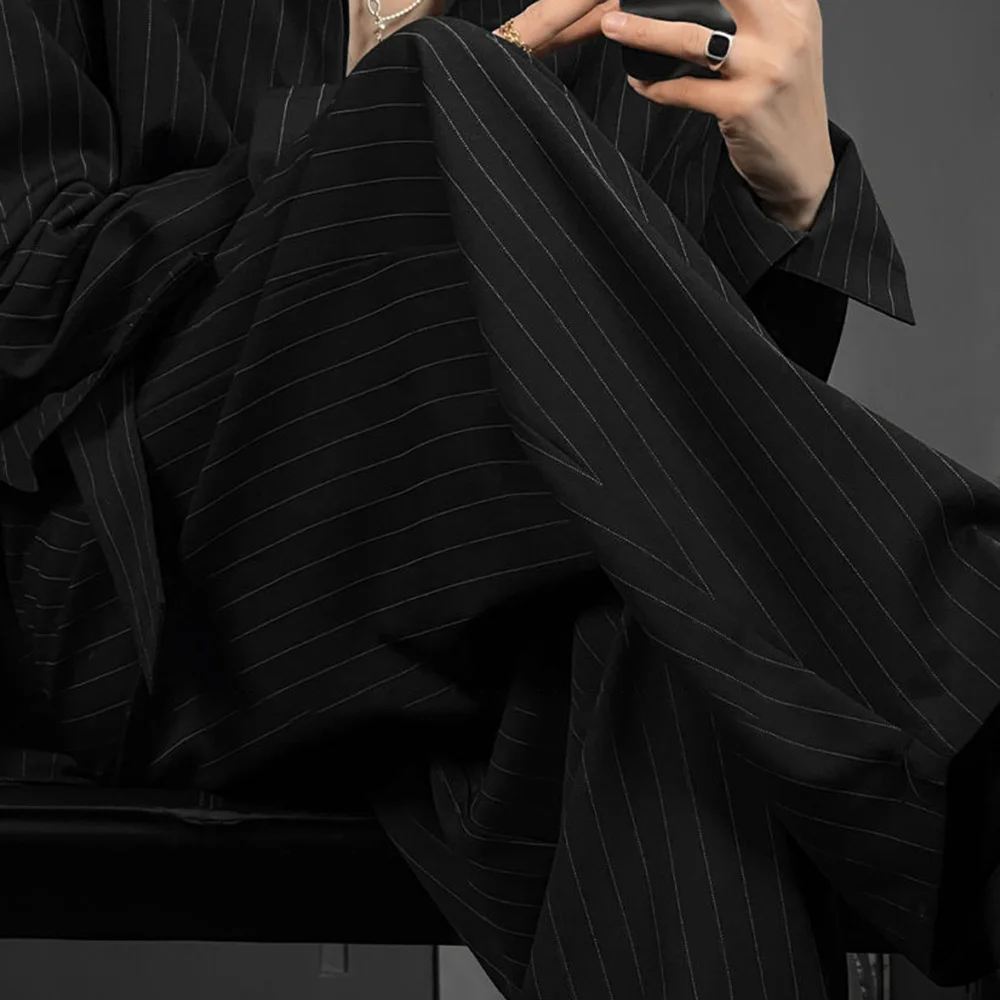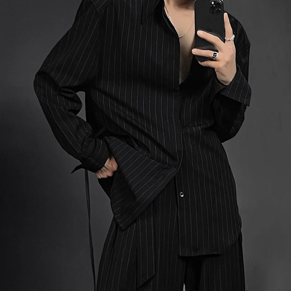 Threebooy Mens Sets Vertical Striped Shirt Belt Trousers Two-Piece Sets Fashionable Personality Versatile Sets Men'S Clothing