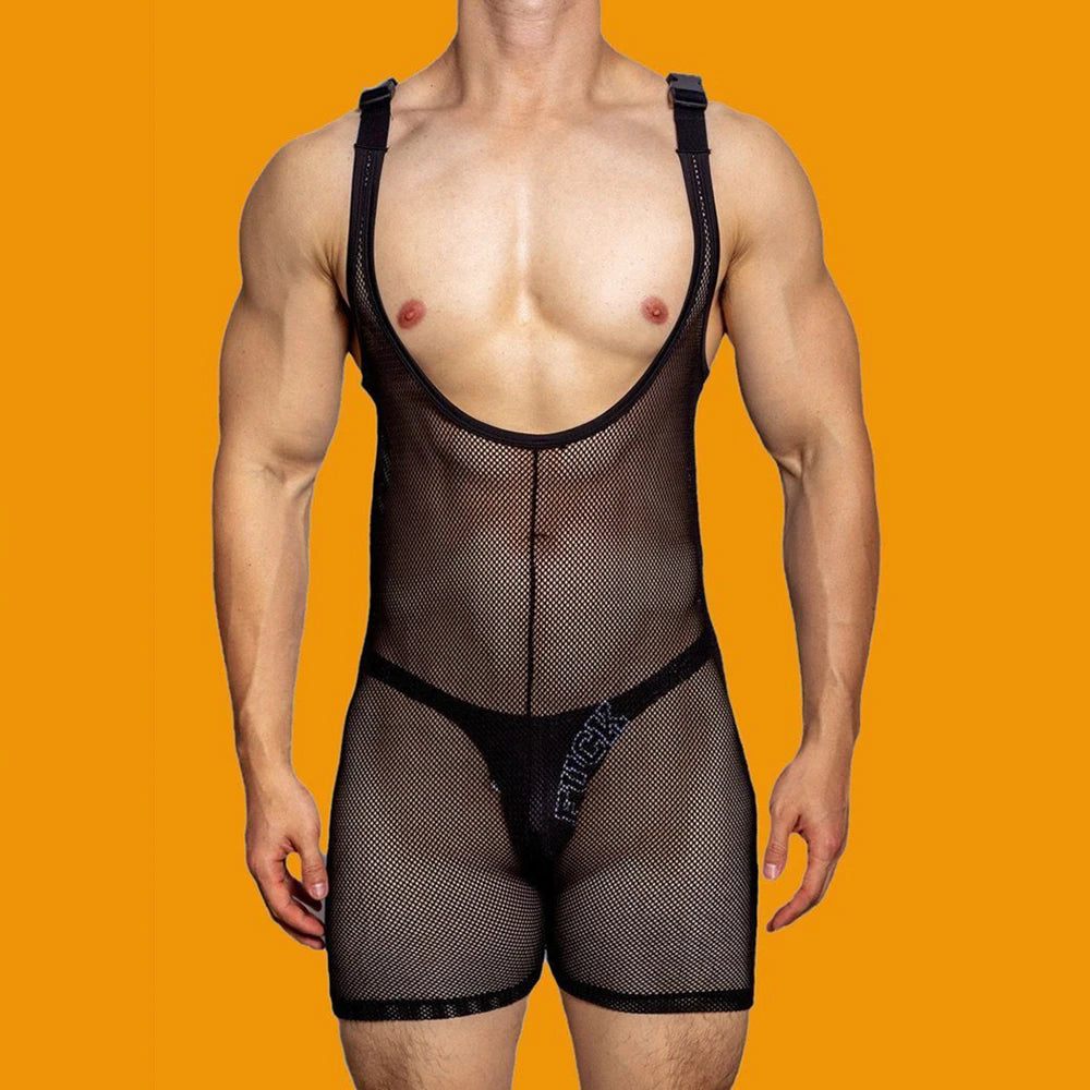 Threebooy Mens sexy tight-fitting solid color mesh see-through jumpsuit shaping breathable sexy suspenders home underwear for men
