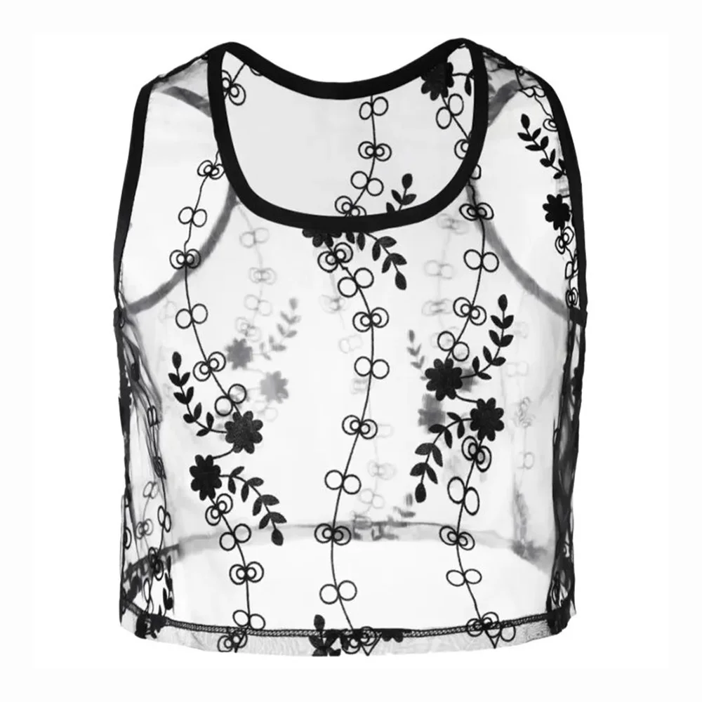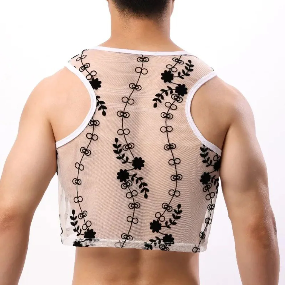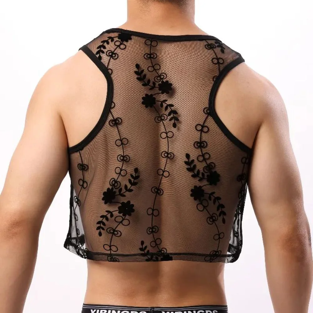 Threebooy Mens Short Vest Transparent Sexy Flower Pattern Vest See-Through Sexy Clothing Breathable Mesh Sleeveless Vest Lgbt Gay Boys