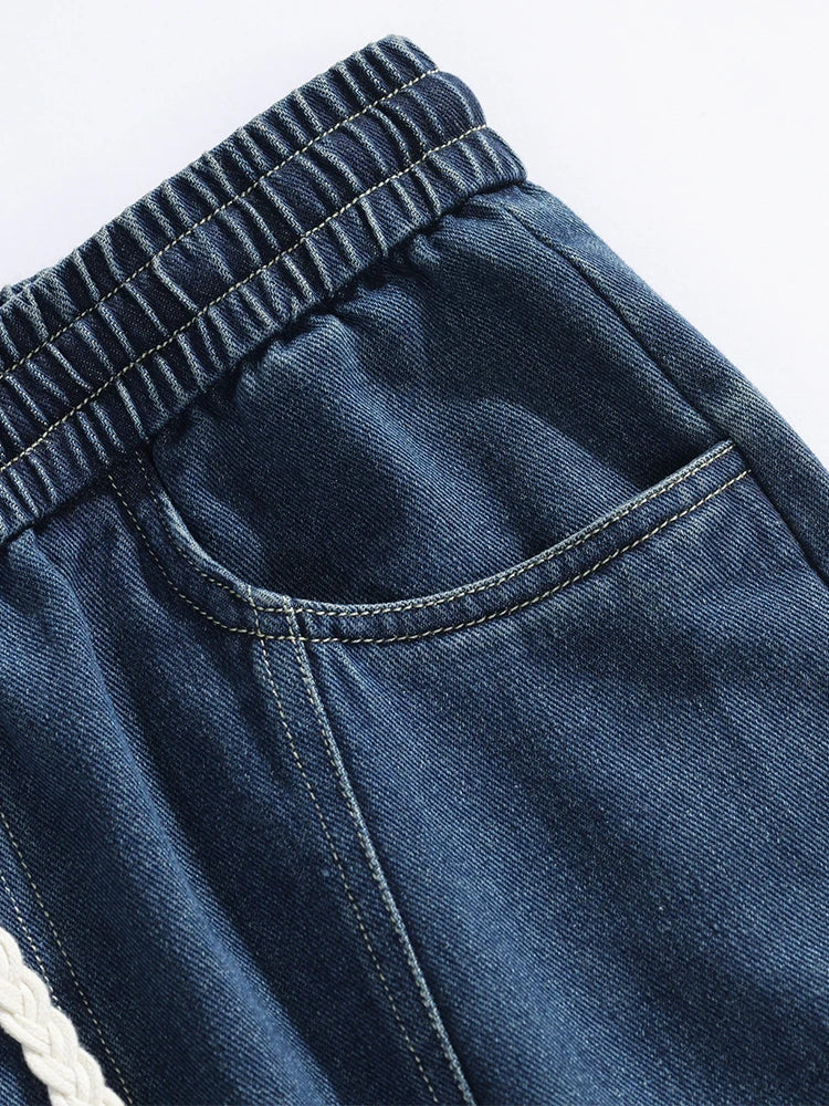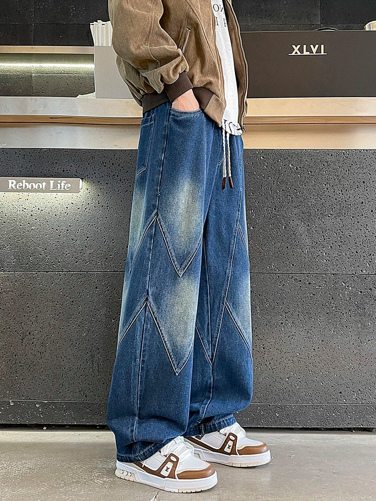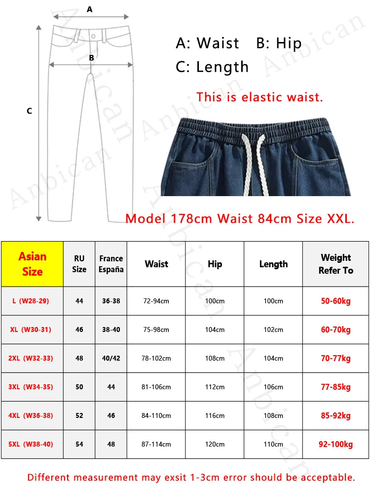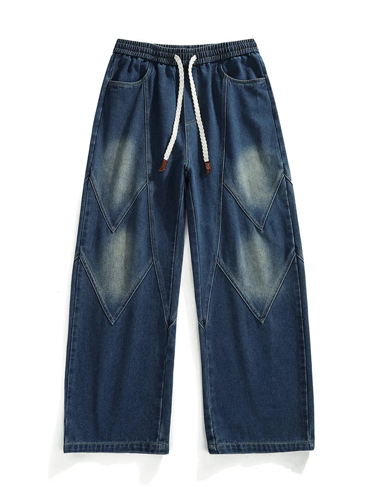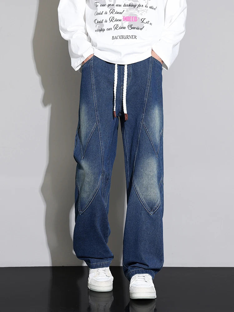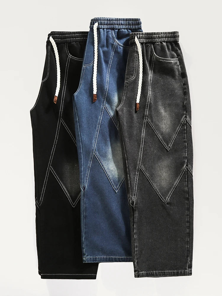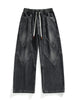Threebooy Men's Straight Baggy Jeans 380g/m² Heavy Fabric Elastic Waist Drawstring Wide Leg Denim Pants Street Y2K Long Jeans 3 Pockets