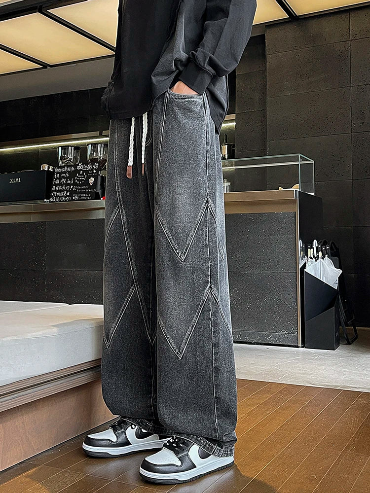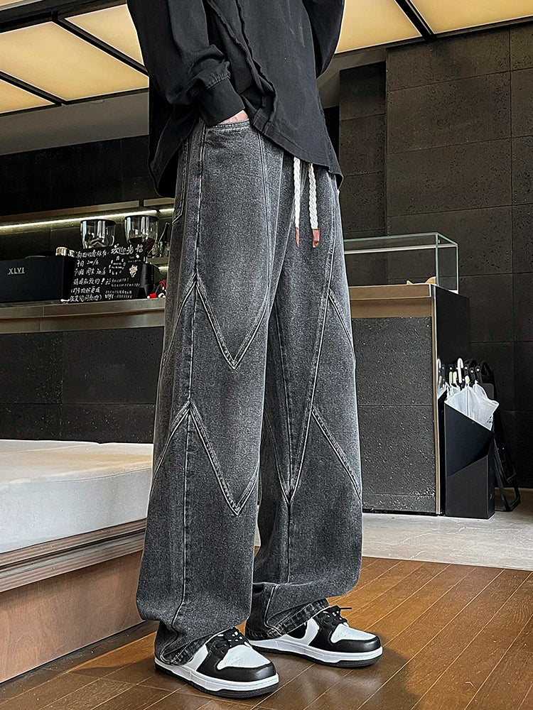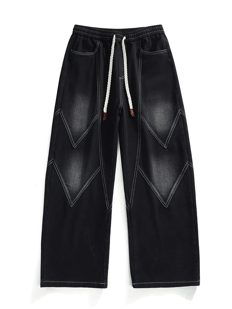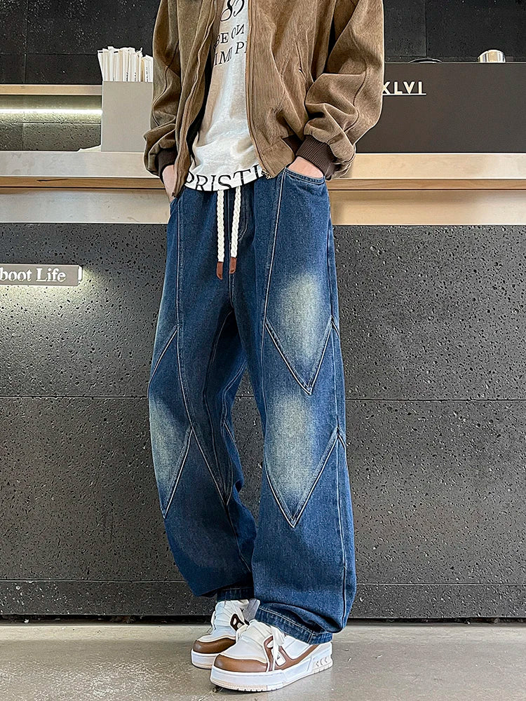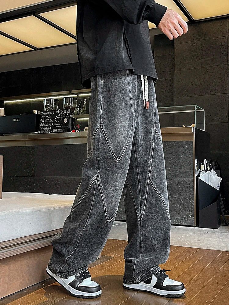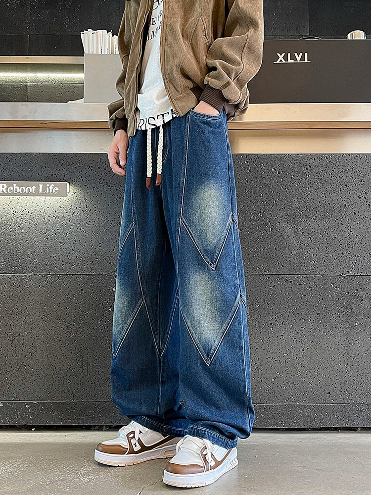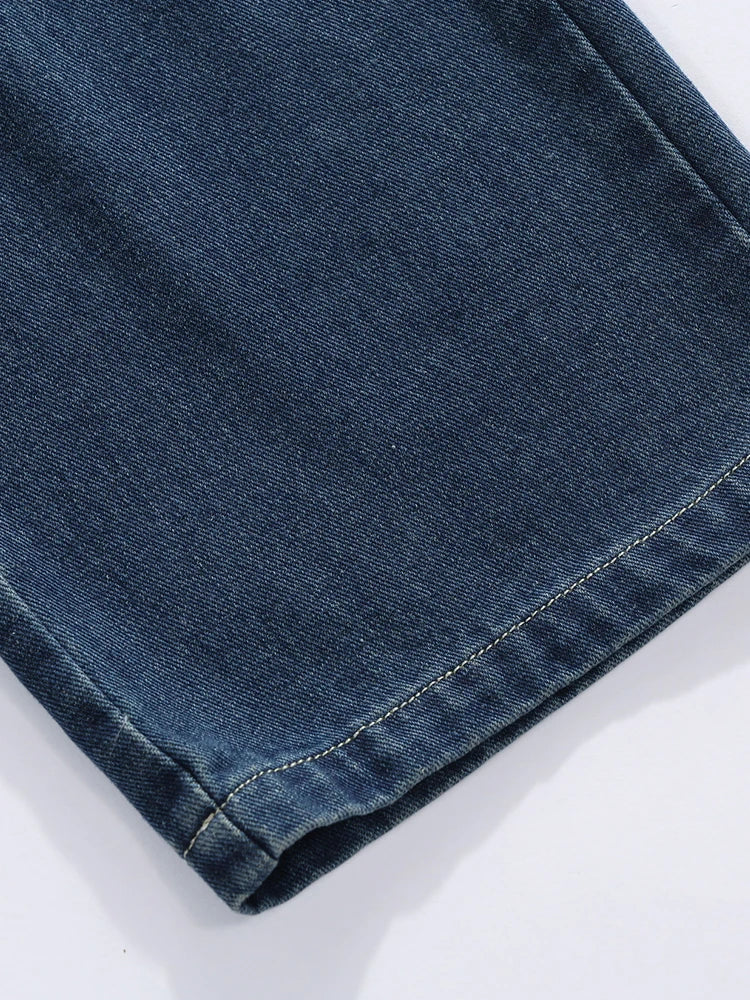 Threebooy Men's Straight Baggy Jeans 380g/m² Heavy Fabric Elastic Waist Drawstring Wide Leg Denim Pants Street Y2K Long Jeans 3 Pockets