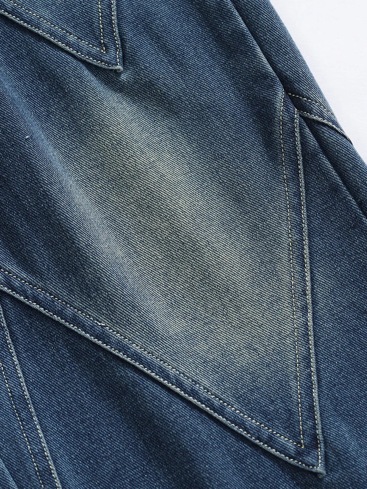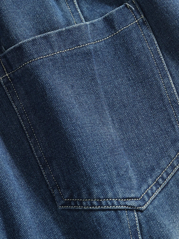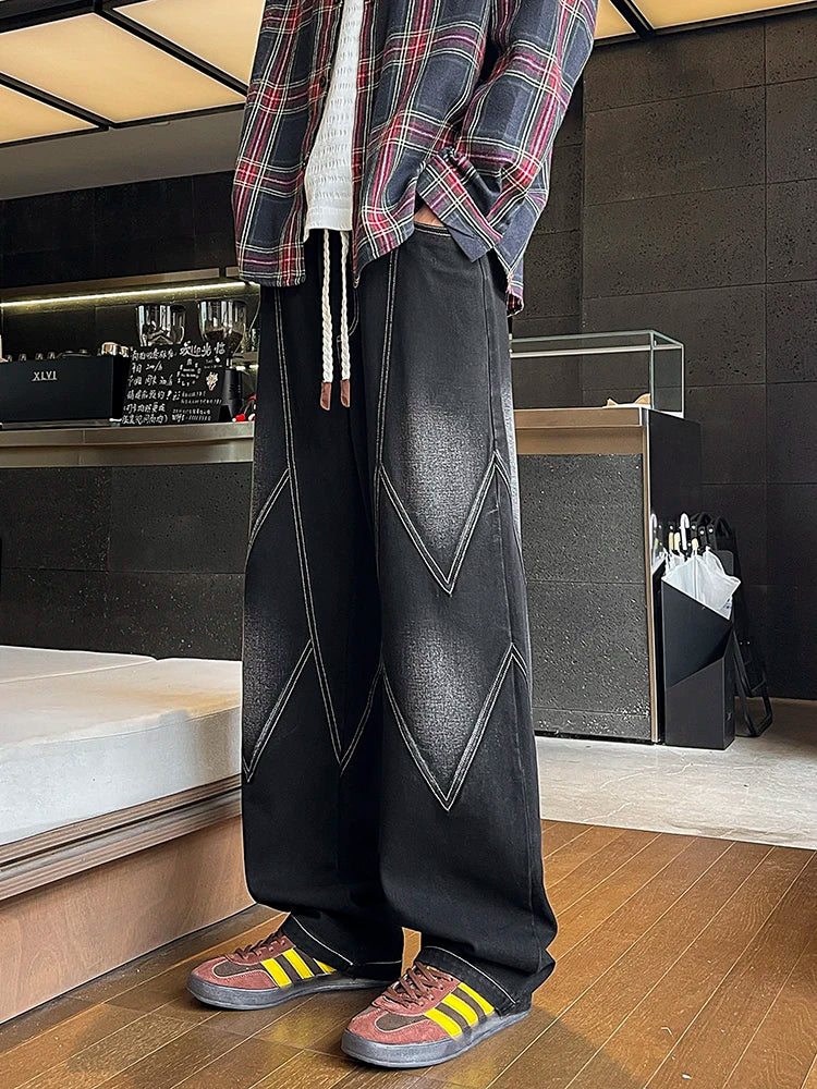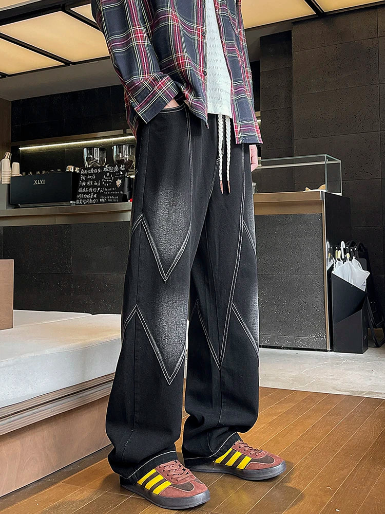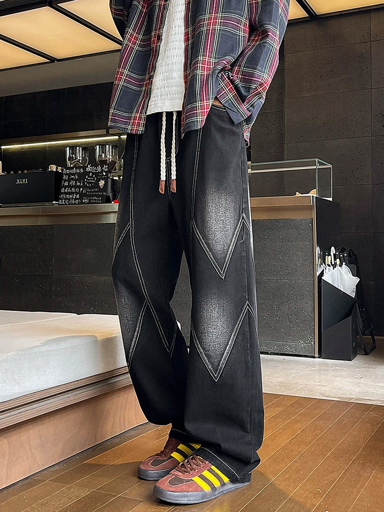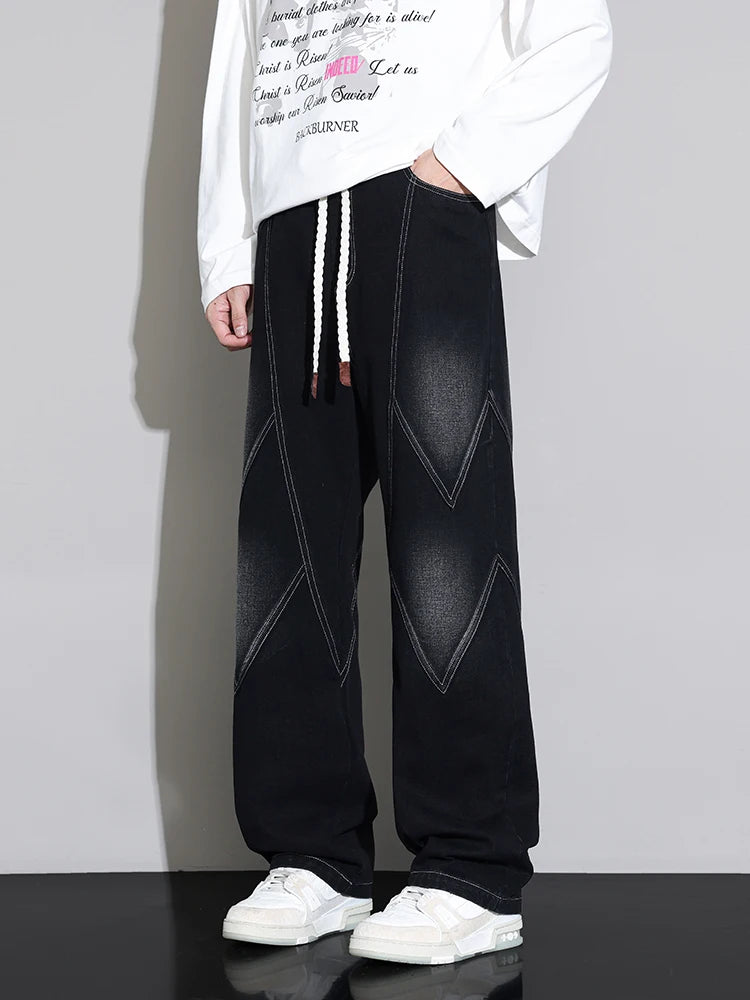 Threebooy Men's Straight Baggy Jeans 380g/m² Heavy Fabric Elastic Waist Drawstring Wide Leg Denim Pants Street Y2K Long Jeans 3 Pockets