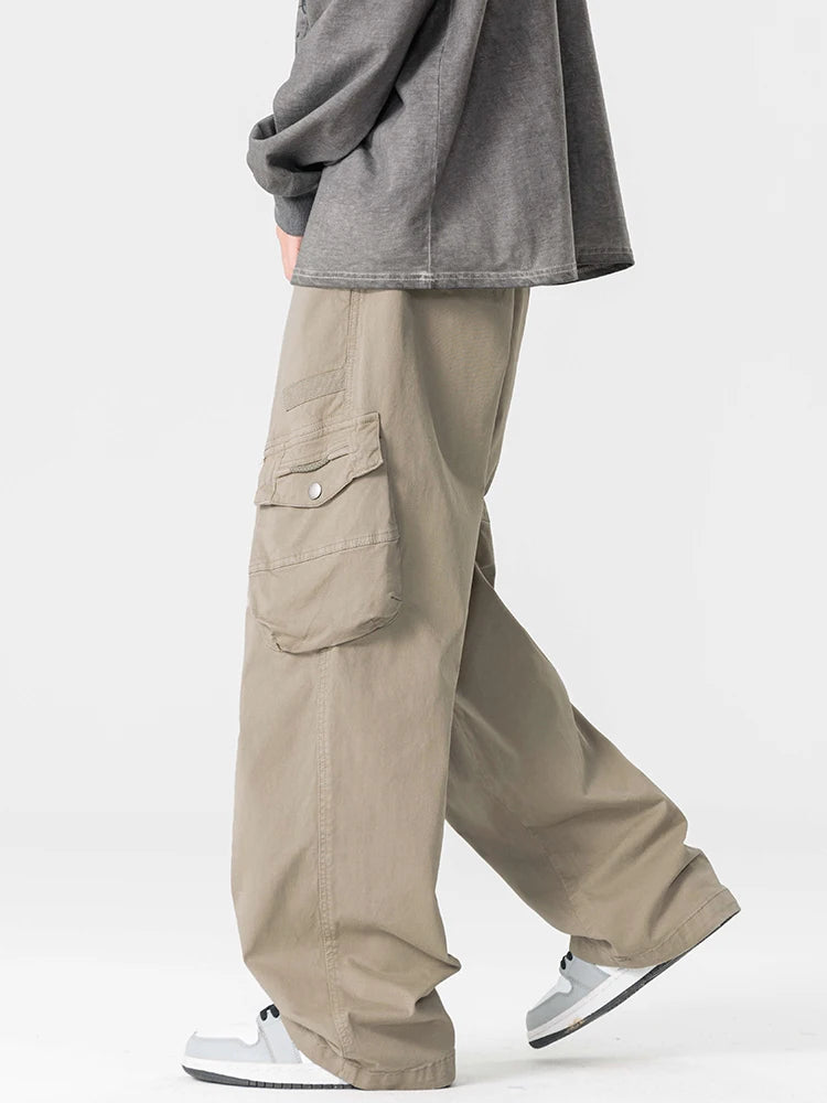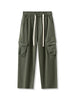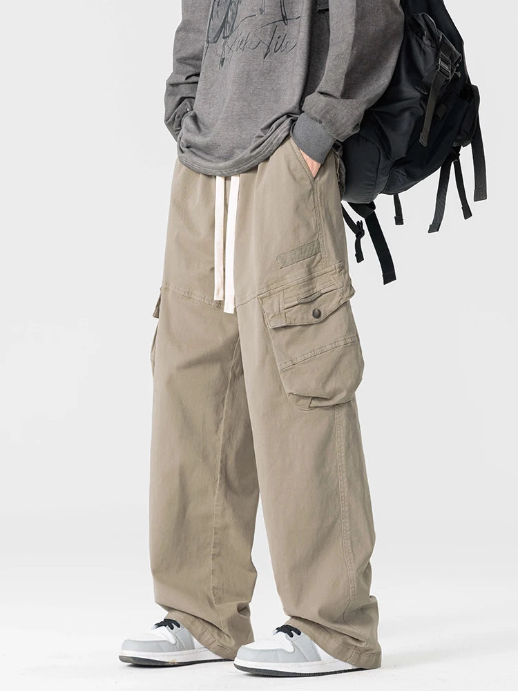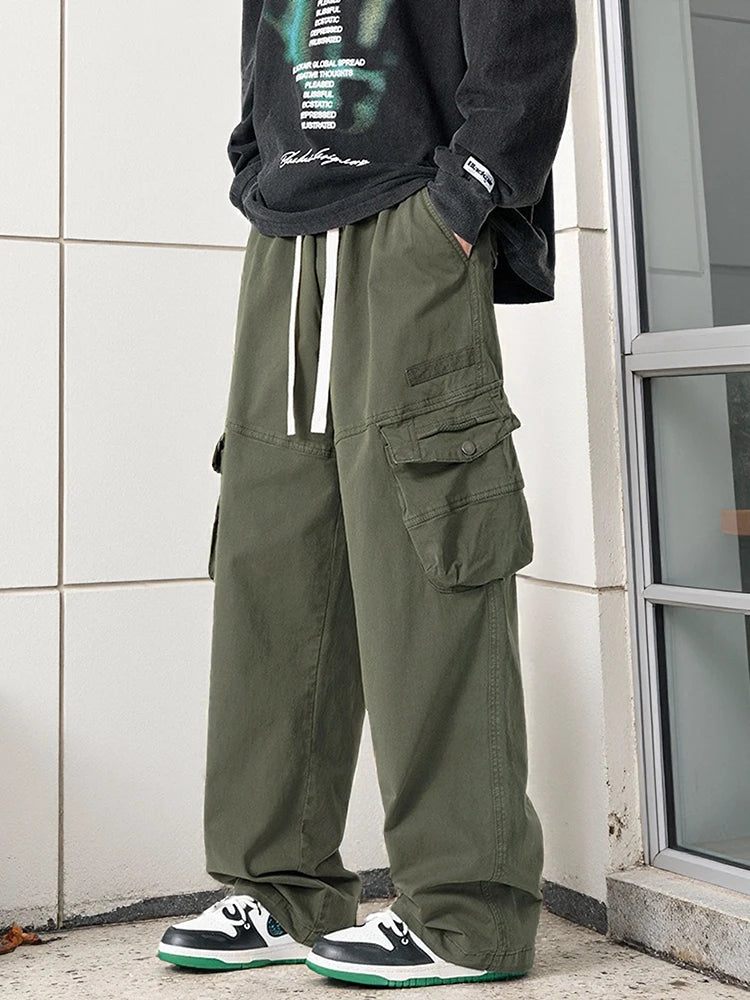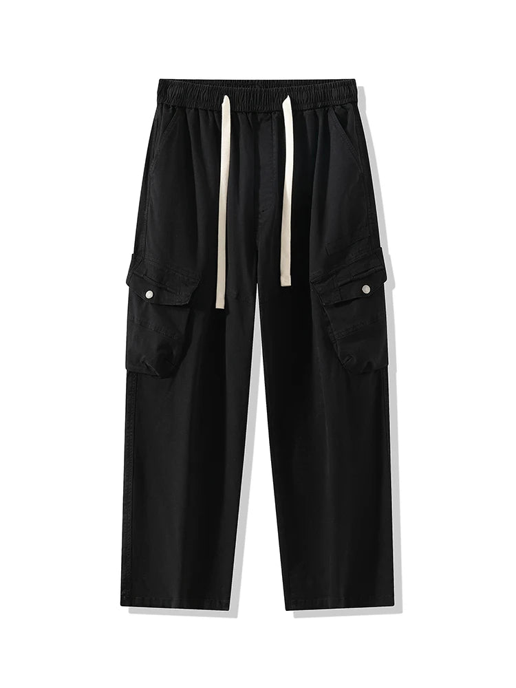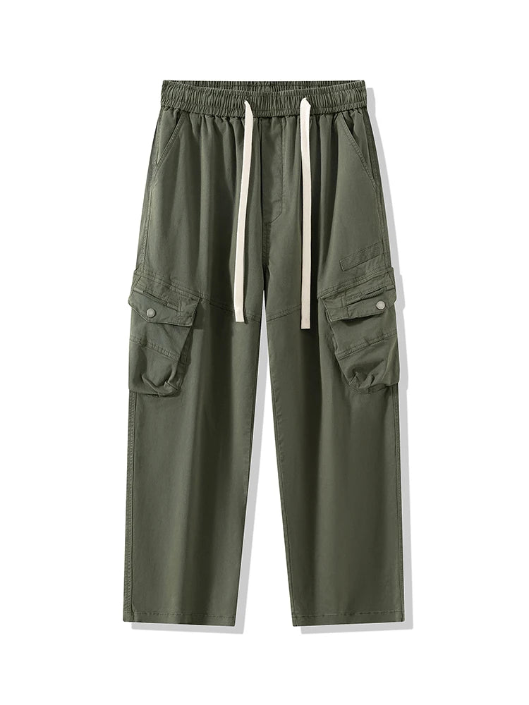 Threebooy Men's Straight Cargo Pants with 4 Pockets Washed Cotton Drawstring Elastic Waist Wide Leg Workwear Casual Pants Loose Fit