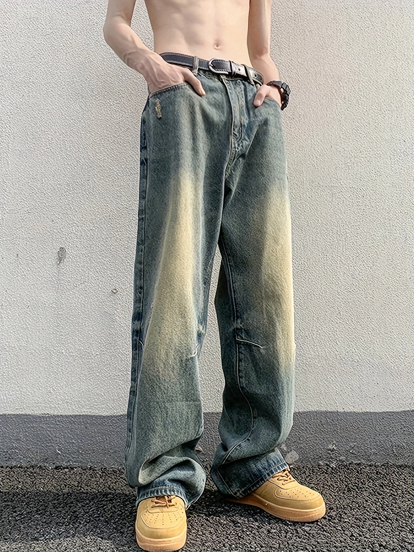 Threebooy Men's Stylish Loose Denim Pants With Pockets, Active Breathable Comfy Straight Leg Trousers For Breakdancing Skateboarding Taking Photos