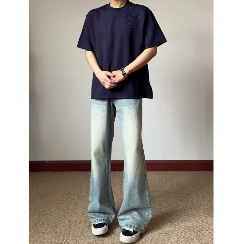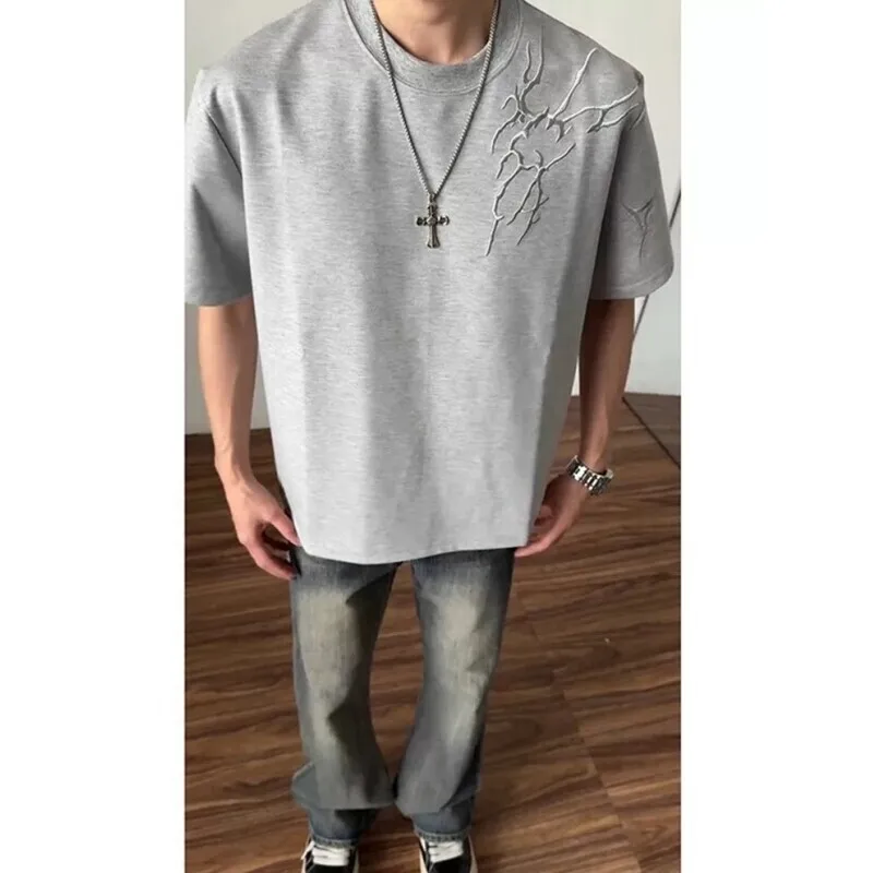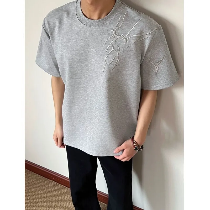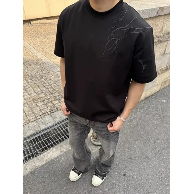Threebooy Men's Summer Thorn Embroidery Round Neck Short Sleeve American High Street Half Sleeve Regular Shoulder T-Shirt