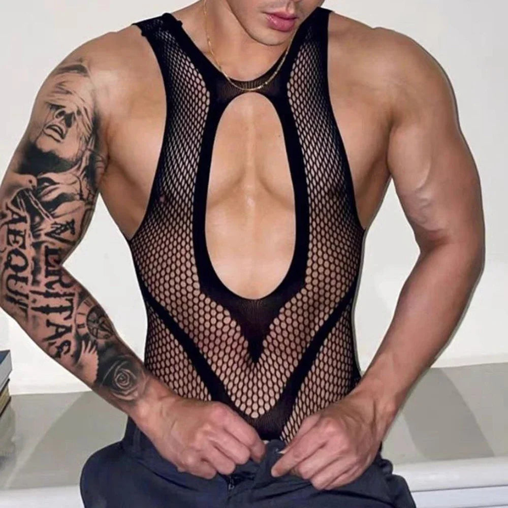 Threebooy Mens Ultra-thin Black Erotic Lingerie Men's Sexy Transparent Mesh Lace Jumpsuit Set See Through Vest Stockings Tights Onesie