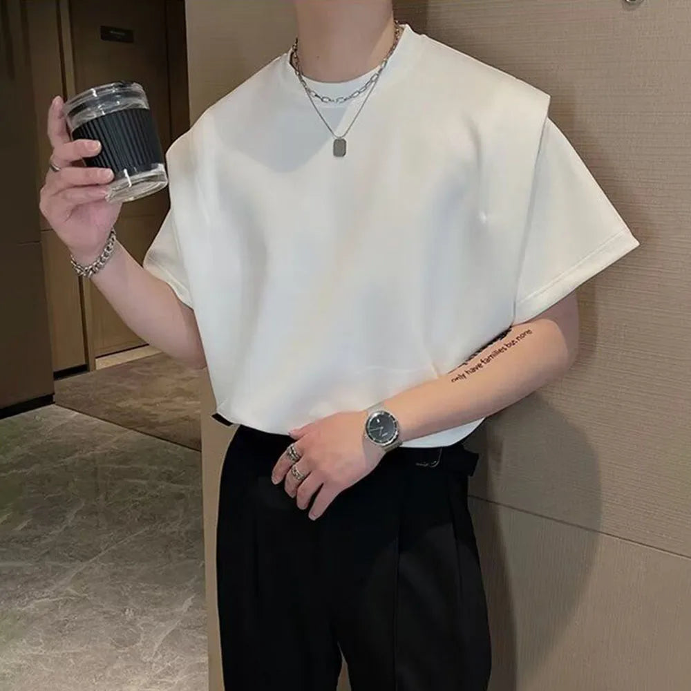 Threebooy Mens Y2k Cotton Shoulder Pad T-Shirt 2024 Summer New Daily Personalized Sleeve Design Solid Streetwear Short-Sleeve Top Unisex