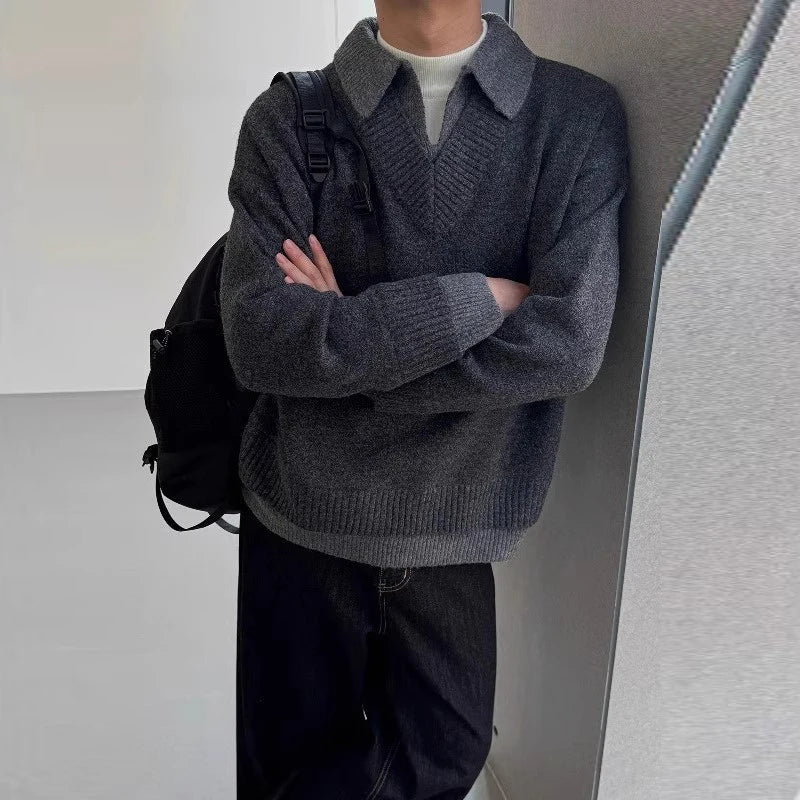 Threebooy New American Chic Polo Neck Men Sweater Light Luxury Fake Two Piece Knit Pullover Trendy High Quality Long Sleeve Knitwear M-2XL