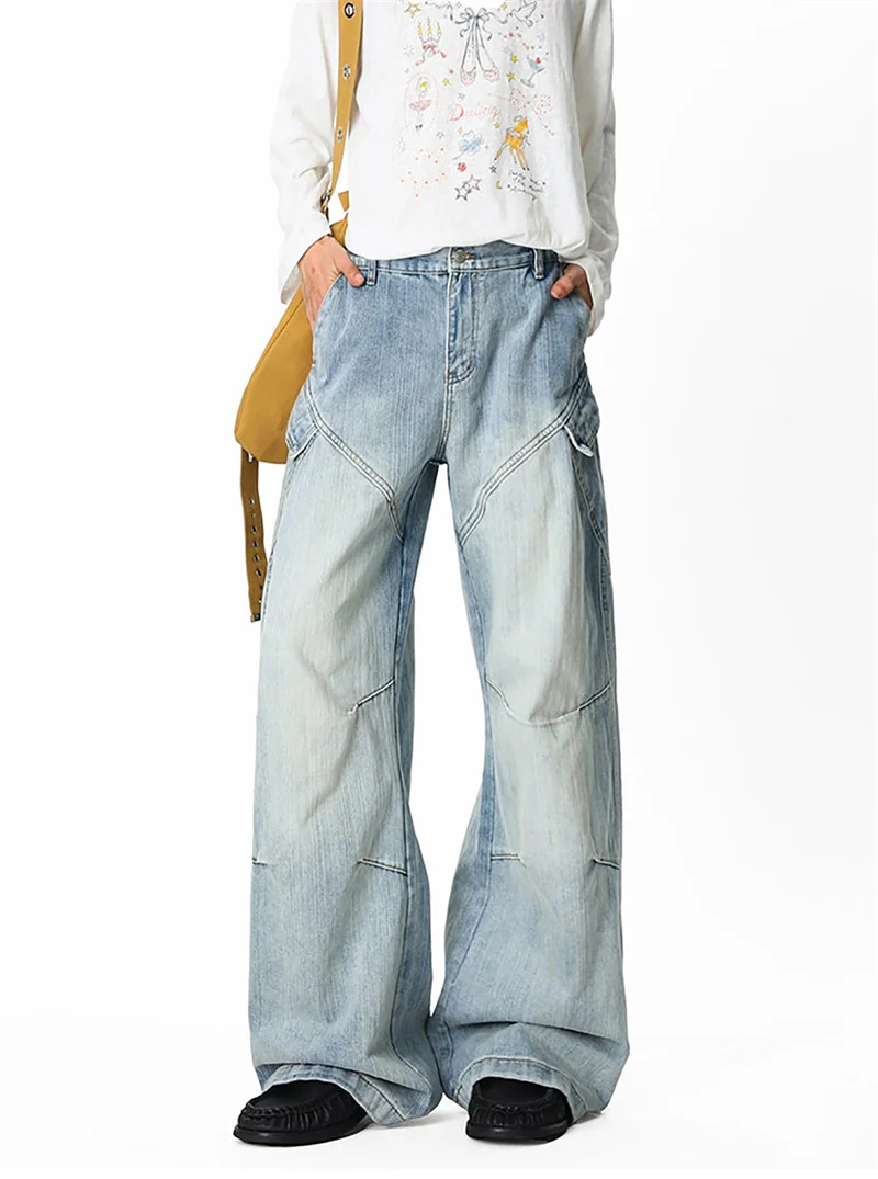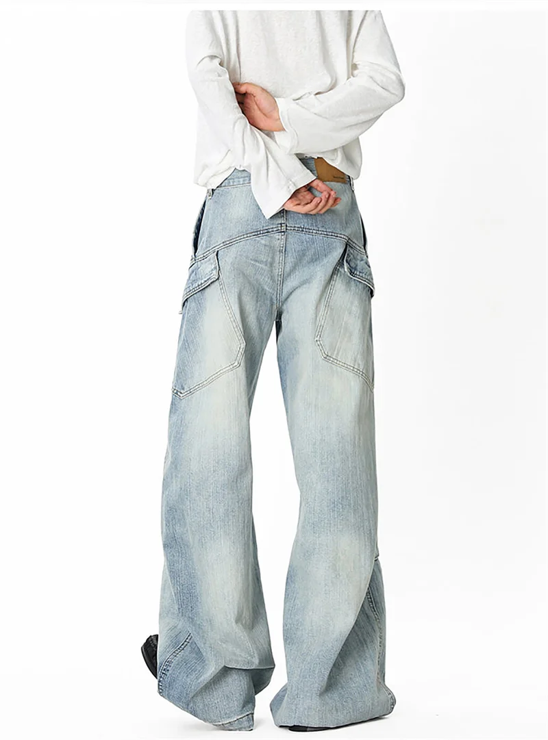 Threebooy New Deconstructed Texture Straight-Leg Jeans For Men American Casual Vintage Blue Denim Pants Y2K Streetwear Baggy Jean