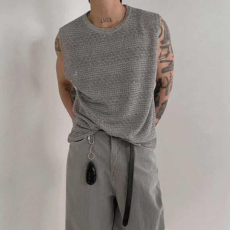 Threebooy New Men Casual Hollow Out Tank Tops Leisure Splicing Solid Color Sleeveless Tees Fashion Streetwear Fitness Stretch Knitted Vest
