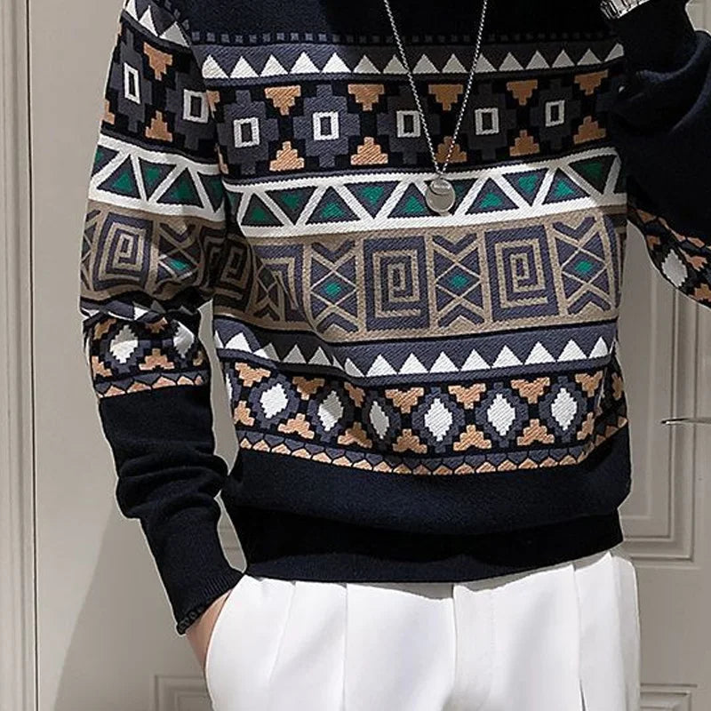 Threebooy New Men's Autumn and Winter Sweatshirts Fashion Trend Casual Warm Long Sleeved Versatile Round Neck Jacquard All-match Pullovers