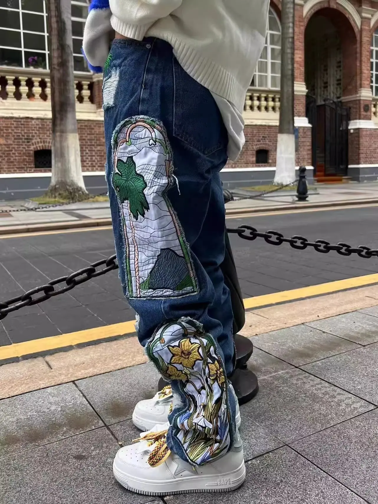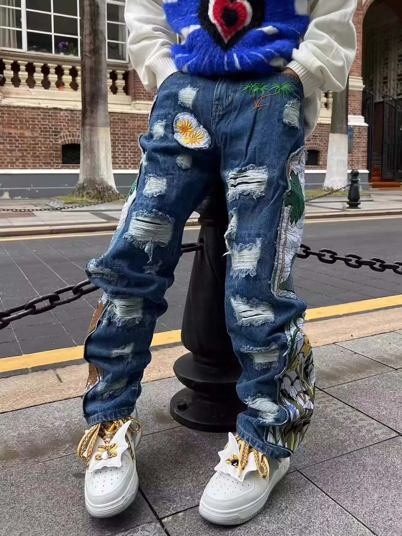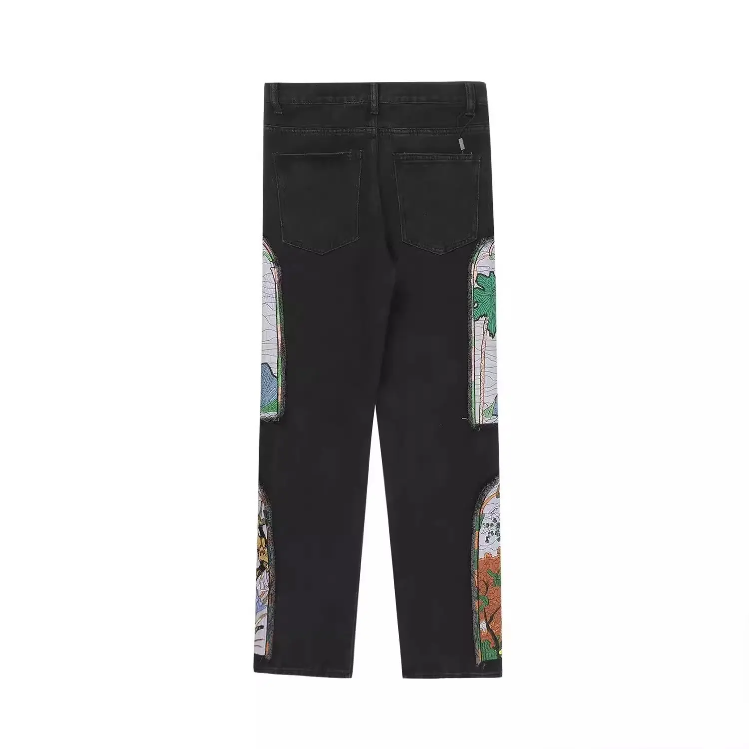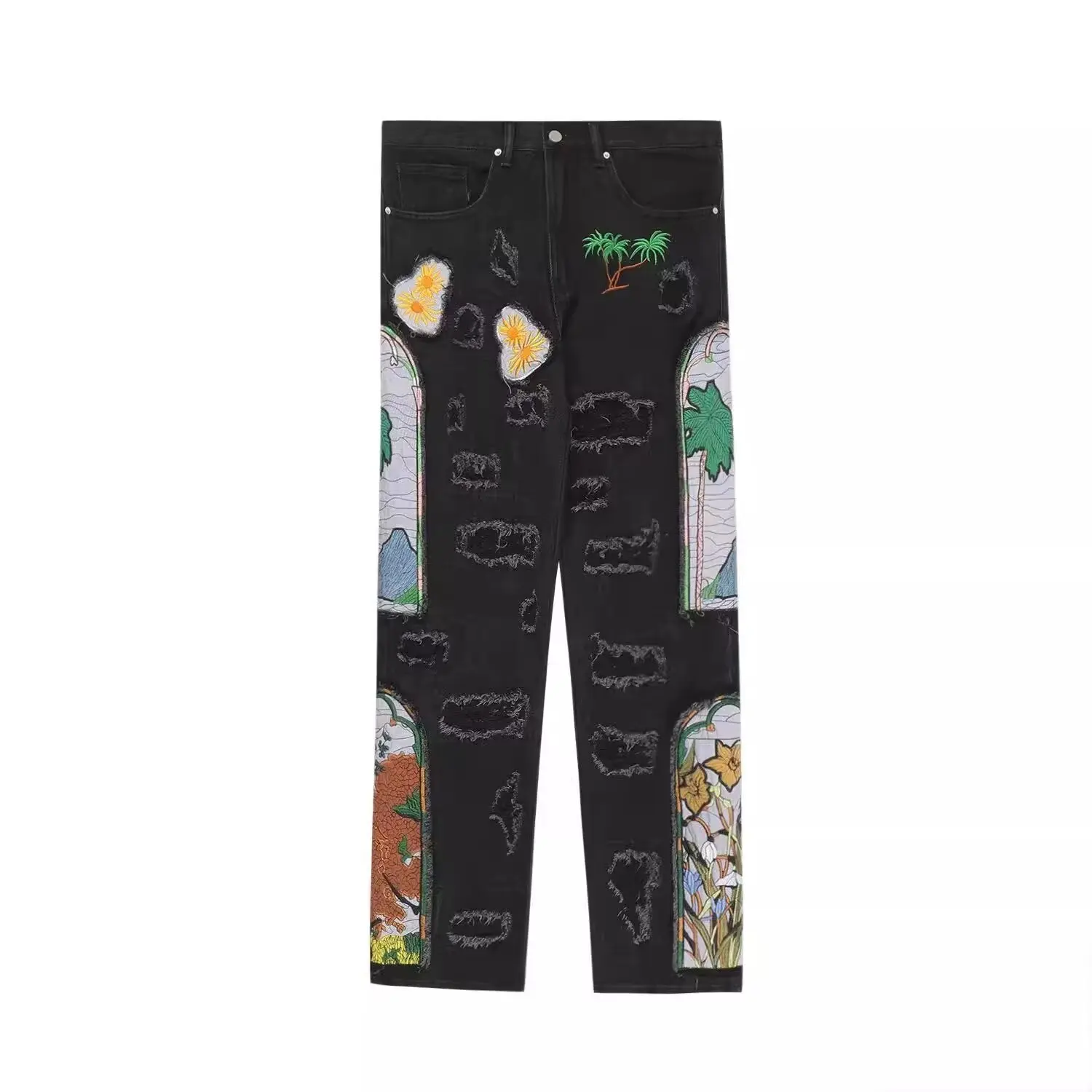 Threebooy New men's women's personality niche loose summer heavy industry embroidery patch straight leg denim pants fashionable wide leg p