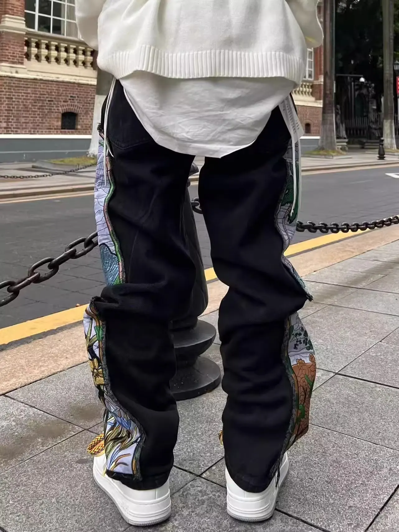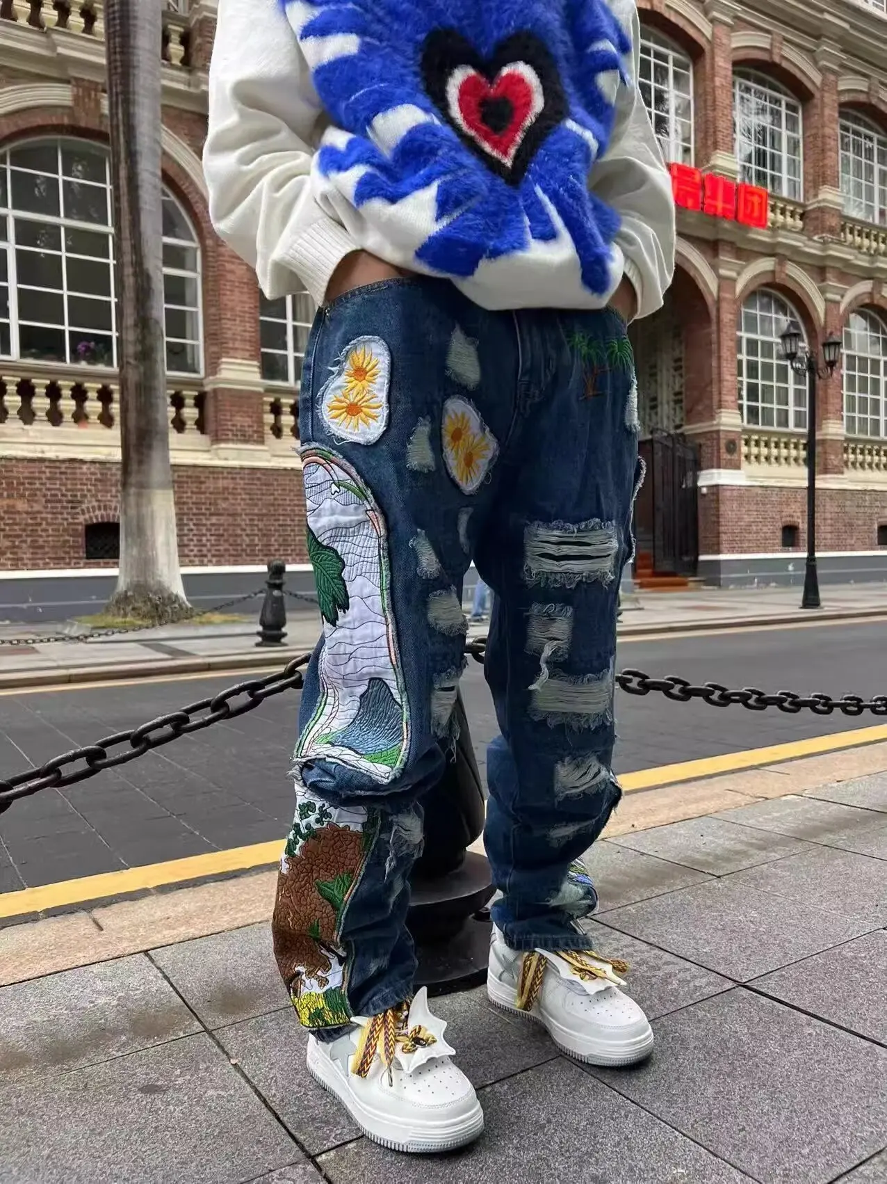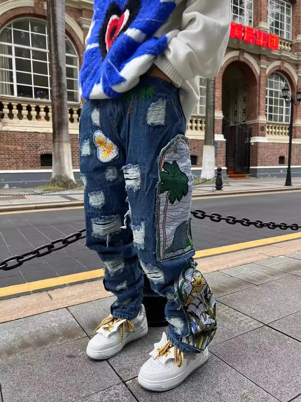 Threebooy New men's women's personality niche loose summer heavy industry embroidery patch straight leg denim pants fashionable wide leg p