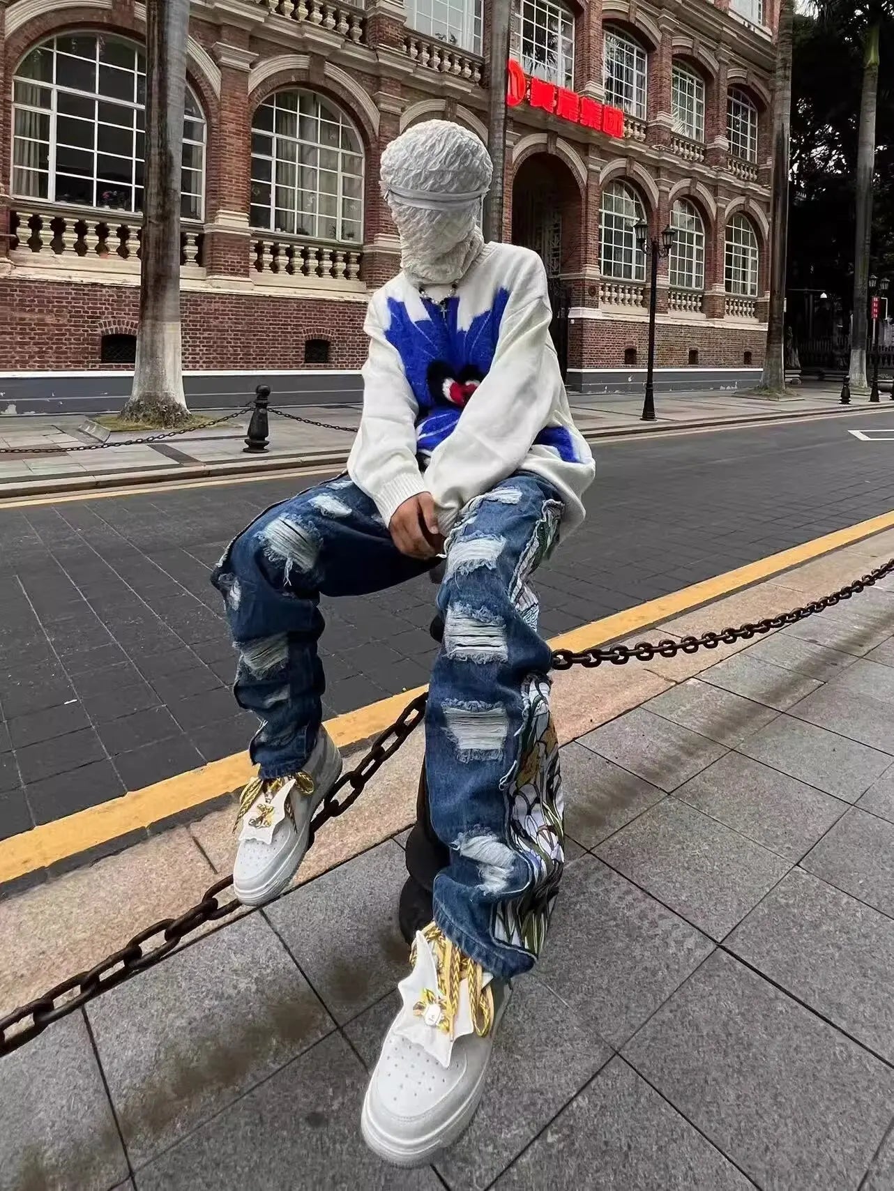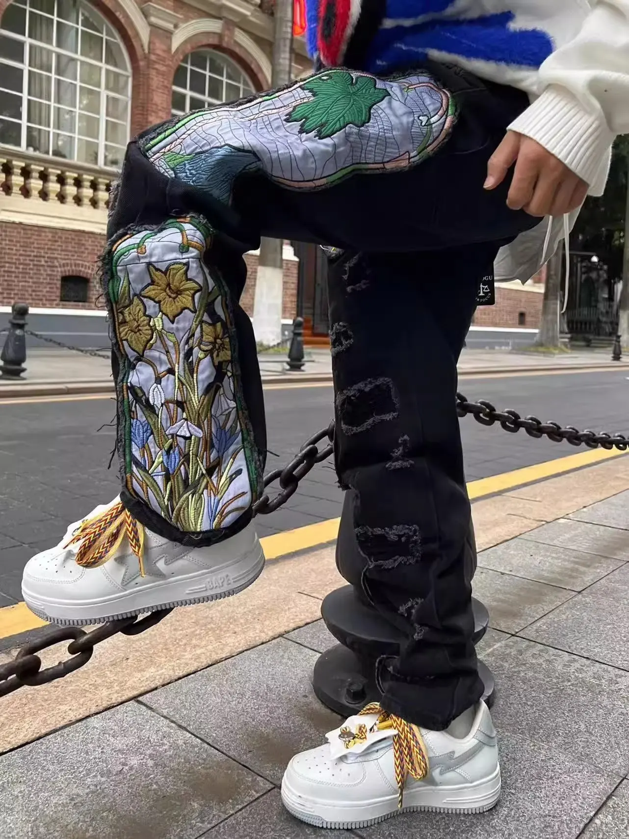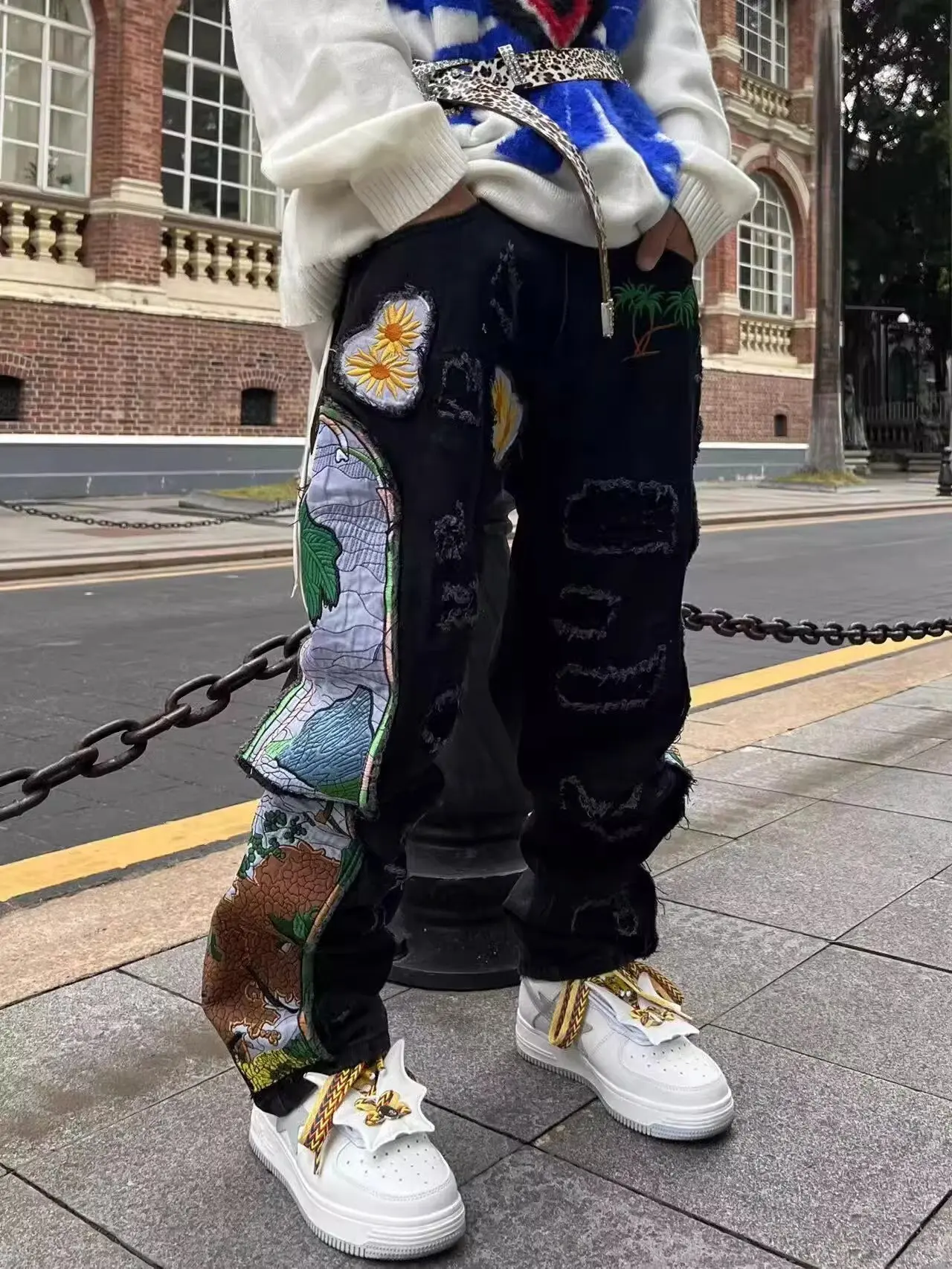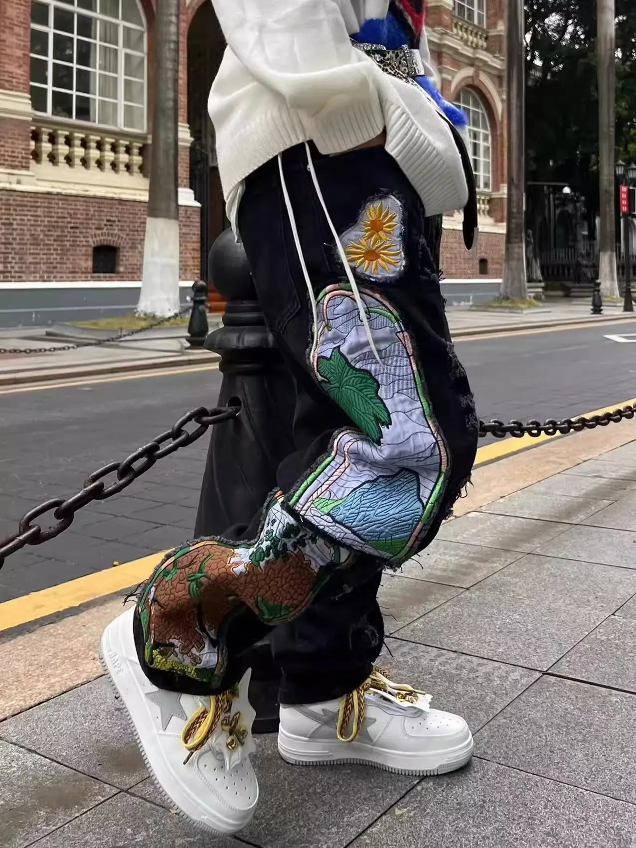 Threebooy New men's women's personality niche loose summer heavy industry embroidery patch straight leg denim pants fashionable wide leg p