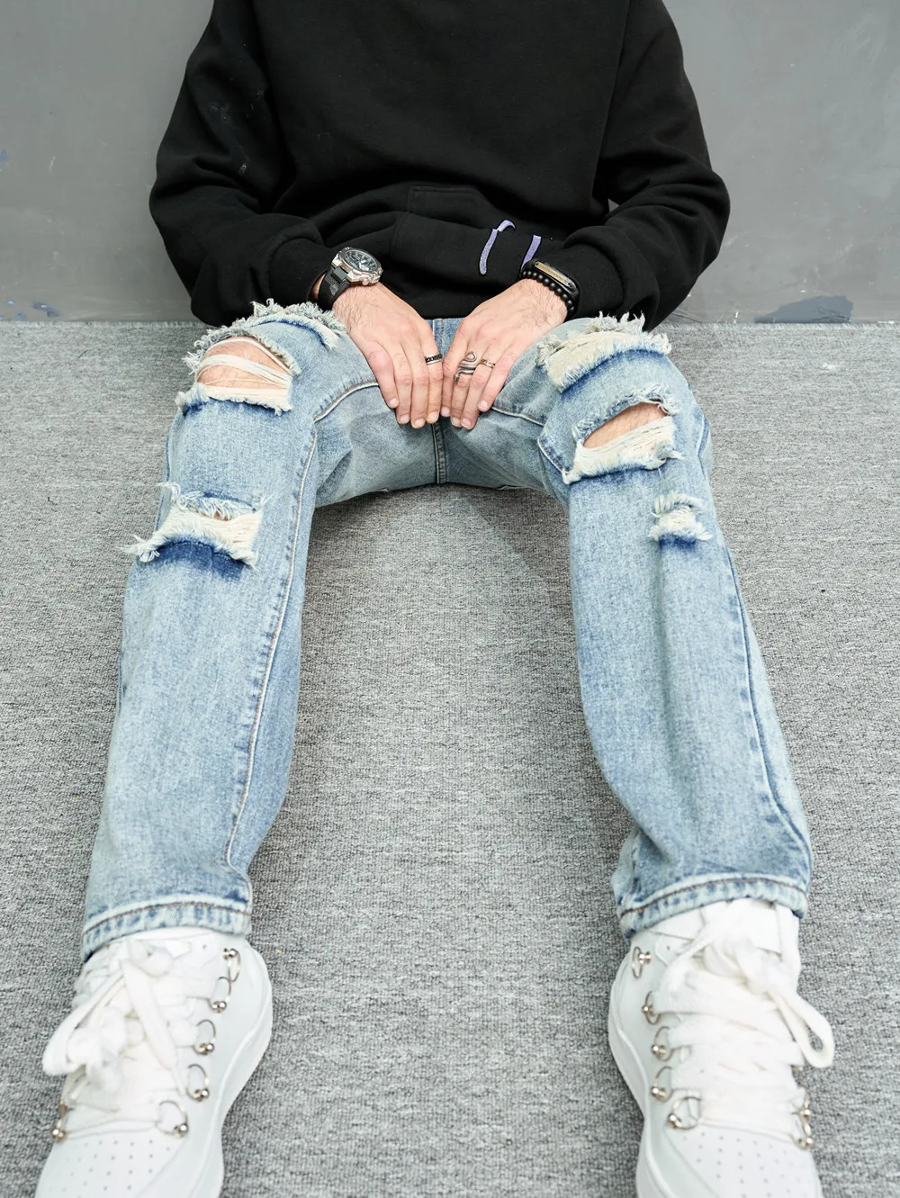 Threebooy New Simple Men Loose Ripped Straight Jeans Pants Male Streetwear Stylish Casual Denim Trousers