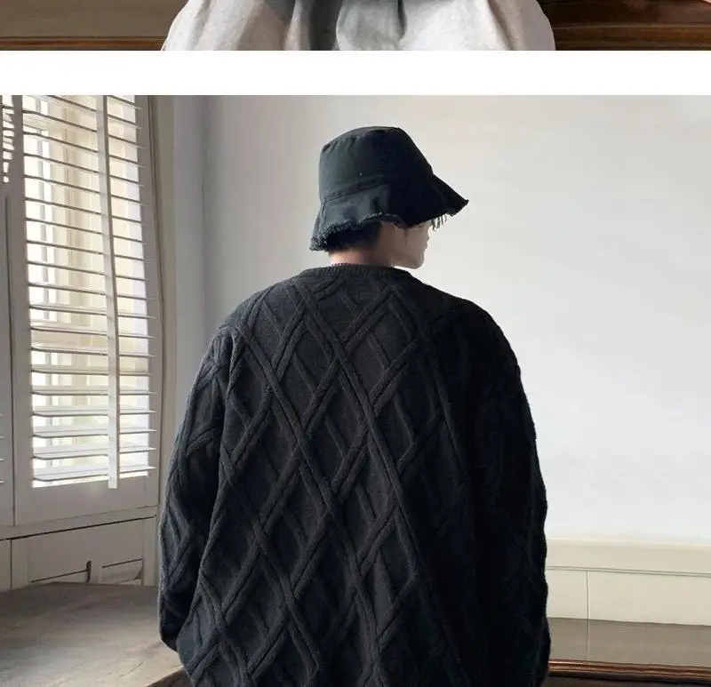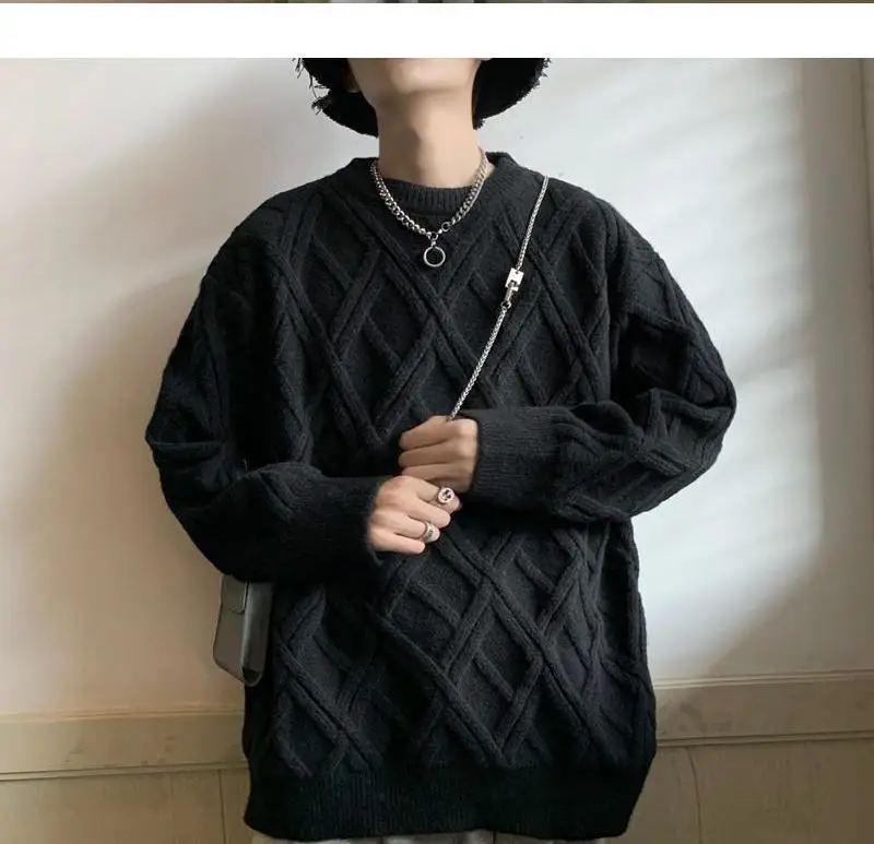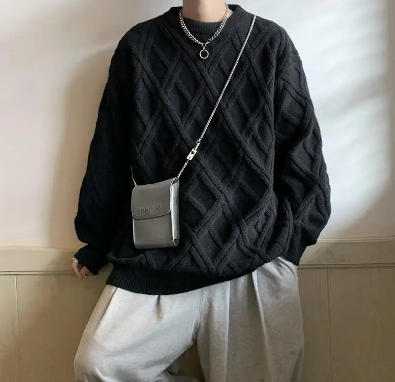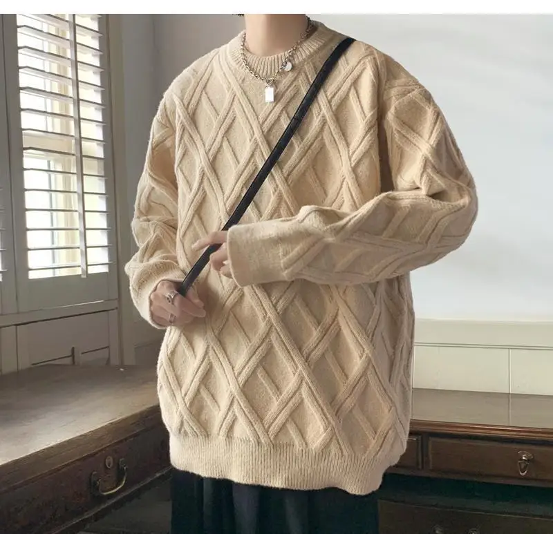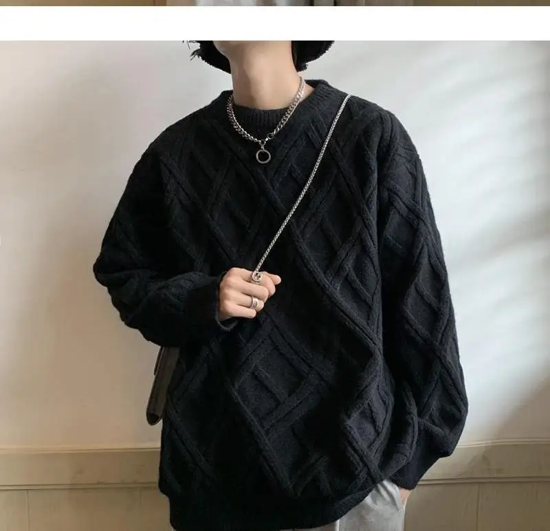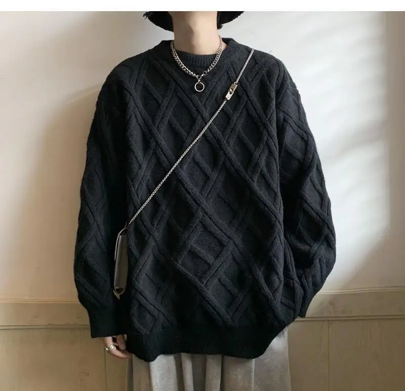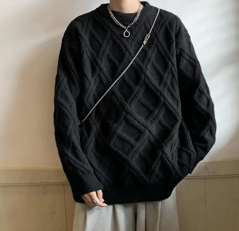 Threebooy Retro Diamond Plaid Sweater Men's Winter Japanese Loose Lazy Style Sweater Round Neck Inner Base Shirt