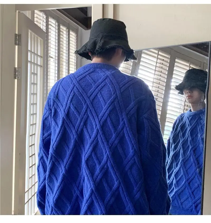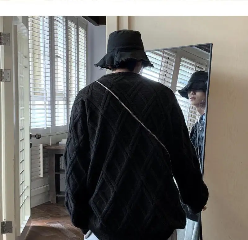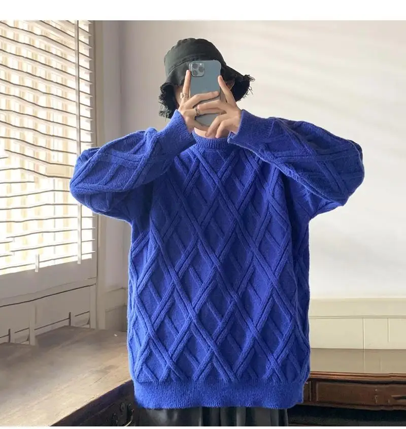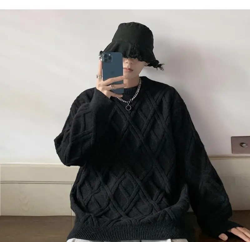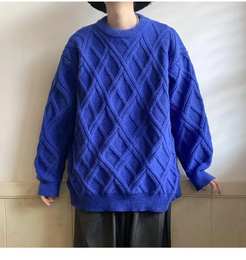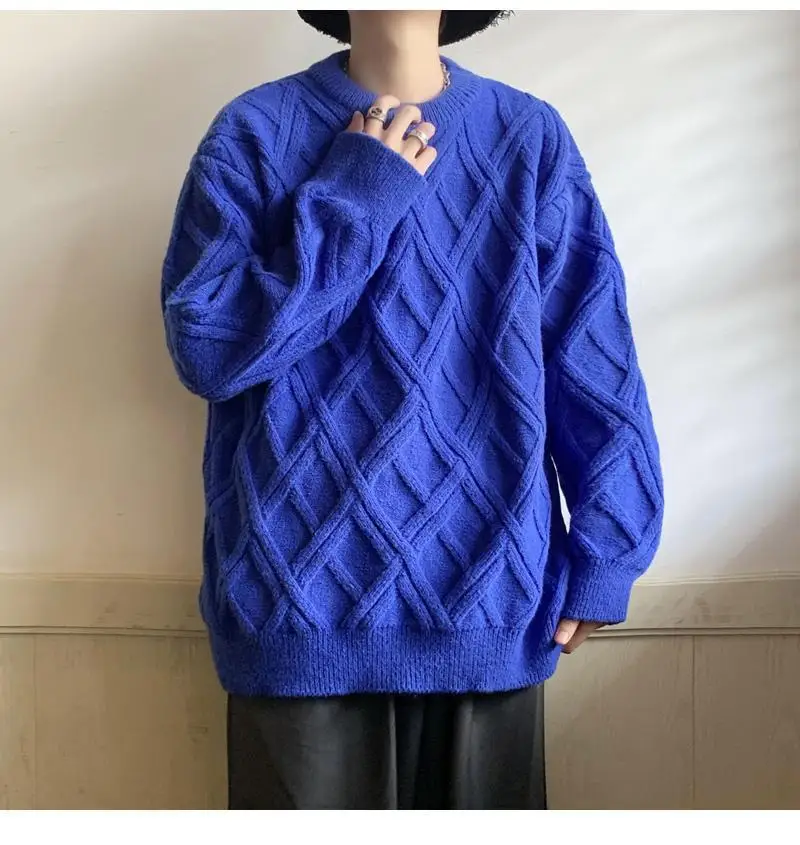Threebooy Retro Diamond Plaid Sweater Men's Winter Japanese Loose Lazy Style Sweater Round Neck Inner Base Shirt