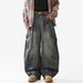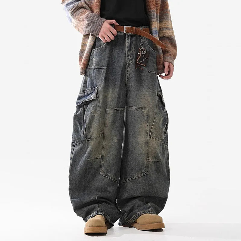 Threebooy Retro Multi Pocket Curved Knife Jeans Autumn And Winter Vintage Wide Leg Workwear Pants Korean Version High Street Men'S Jeans
