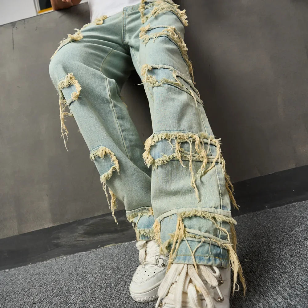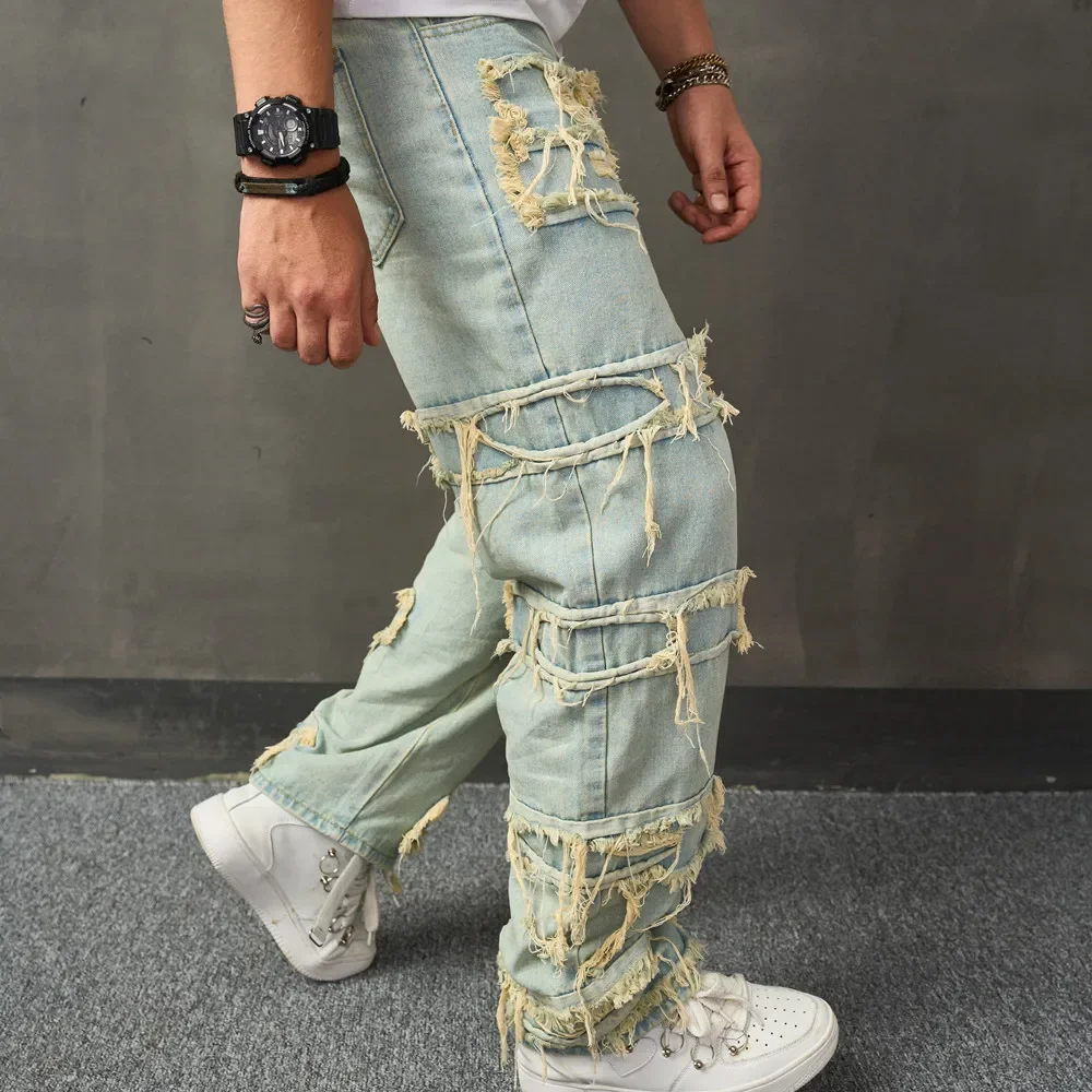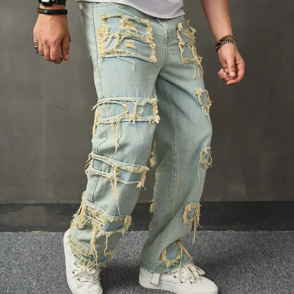 Threebooy Retro Style Men HipHop Ripped Patch Spliced Biker Jeans Men's Stylish Motorcycle Casual Straight Denim Pants