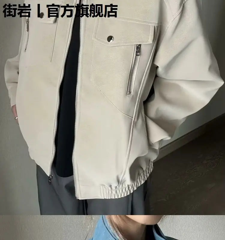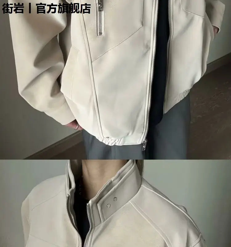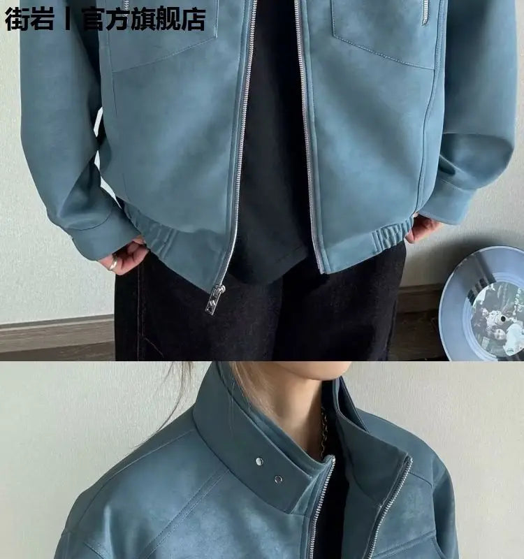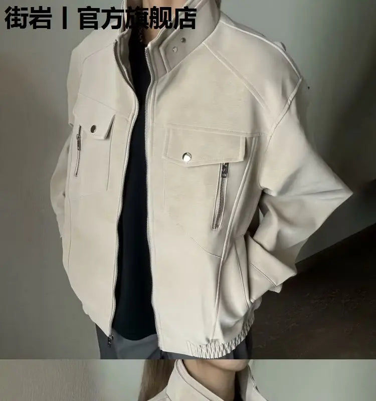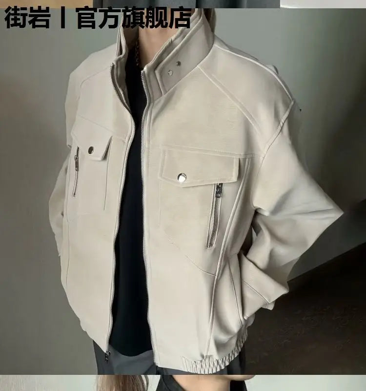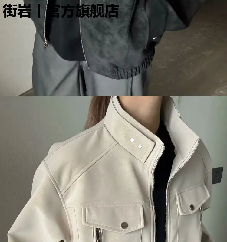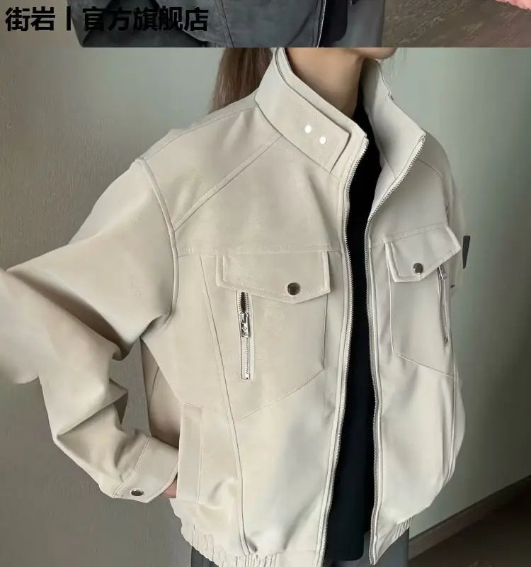 Threebooy Short Spring Stand Collar Loose Sleeve Top American High-end Neutral Versatile PU Leather Jacket Fashion Trendy Design Jacket