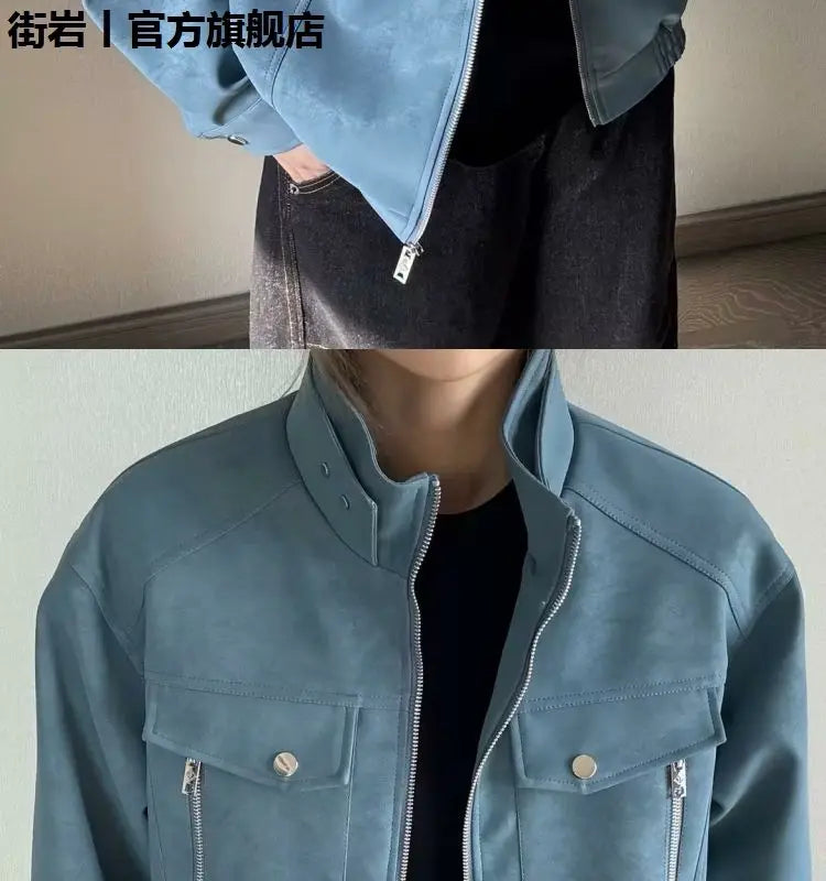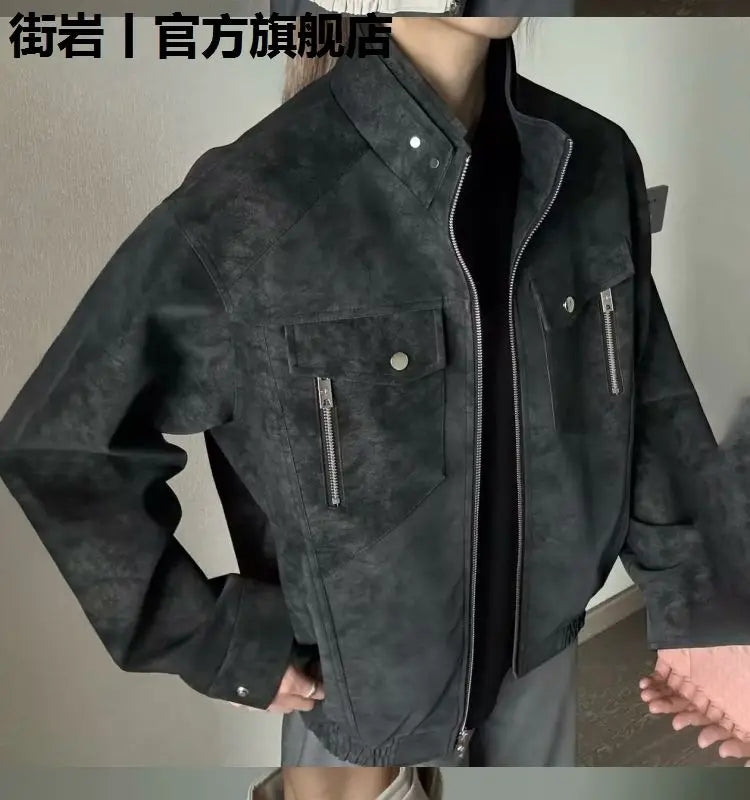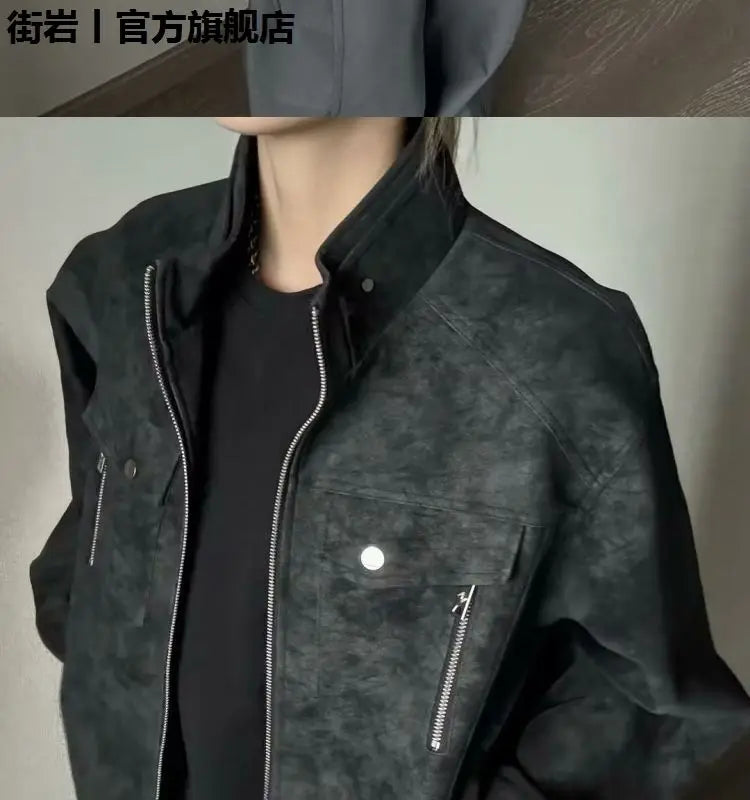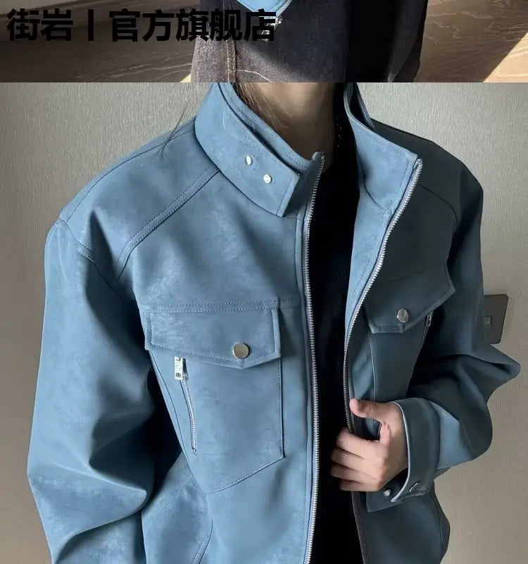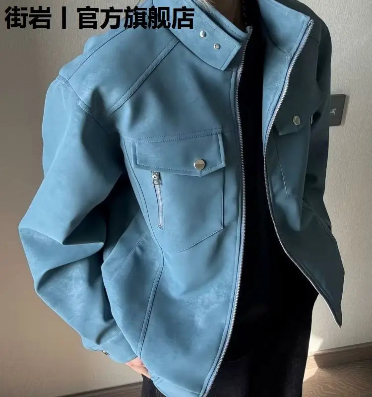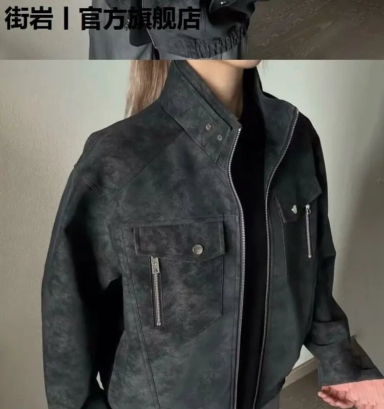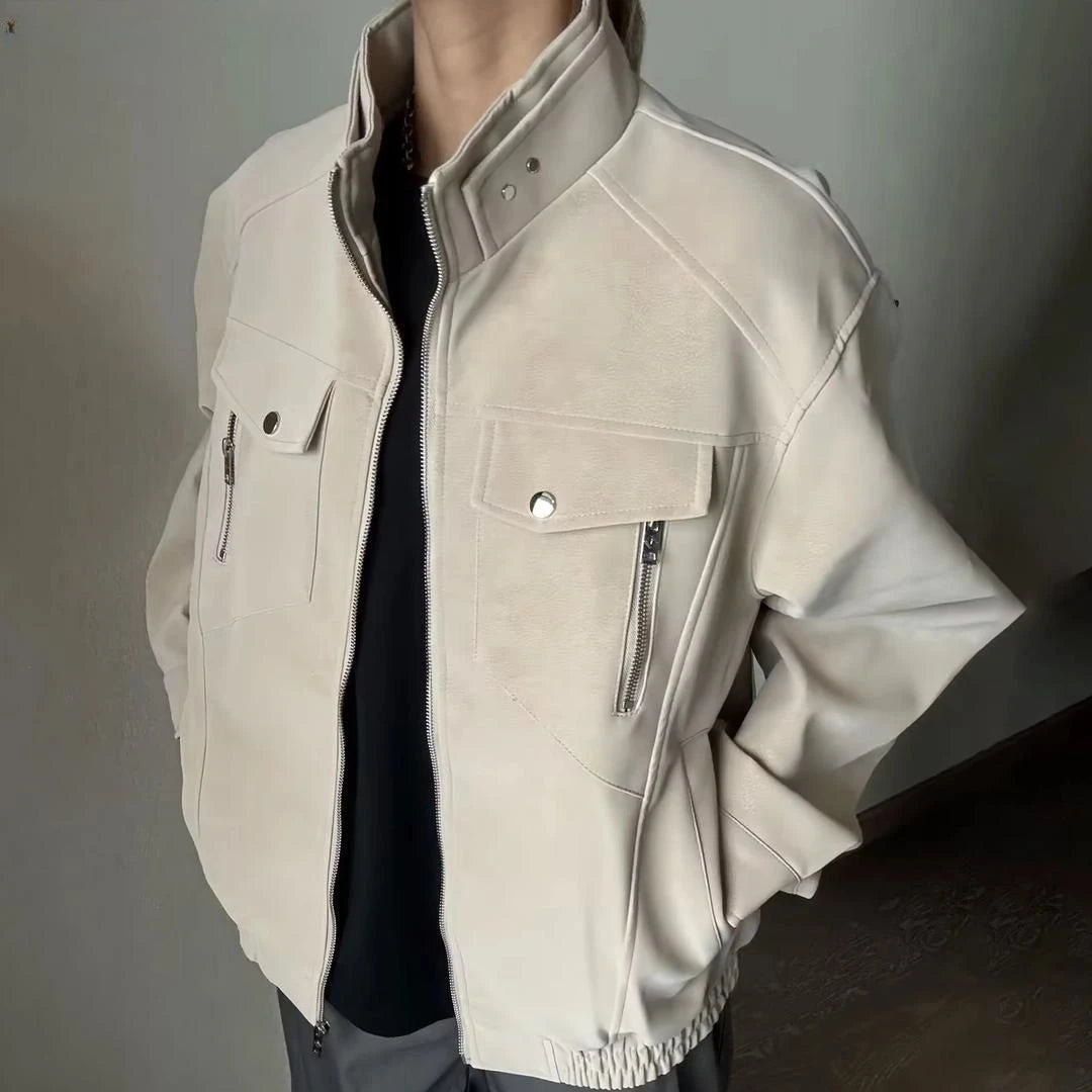Threebooy Short Spring Stand Collar Loose Sleeve Top American High-end Neutral Versatile PU Leather Jacket Fashion Trendy Design Jacket