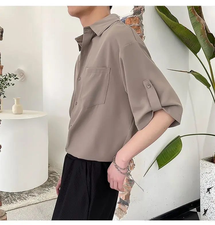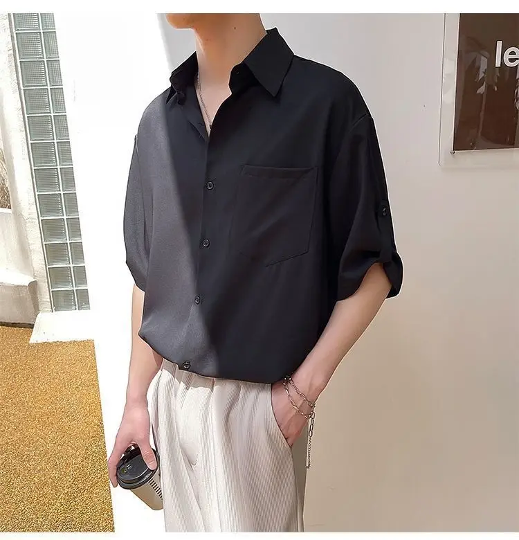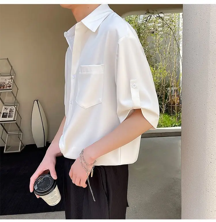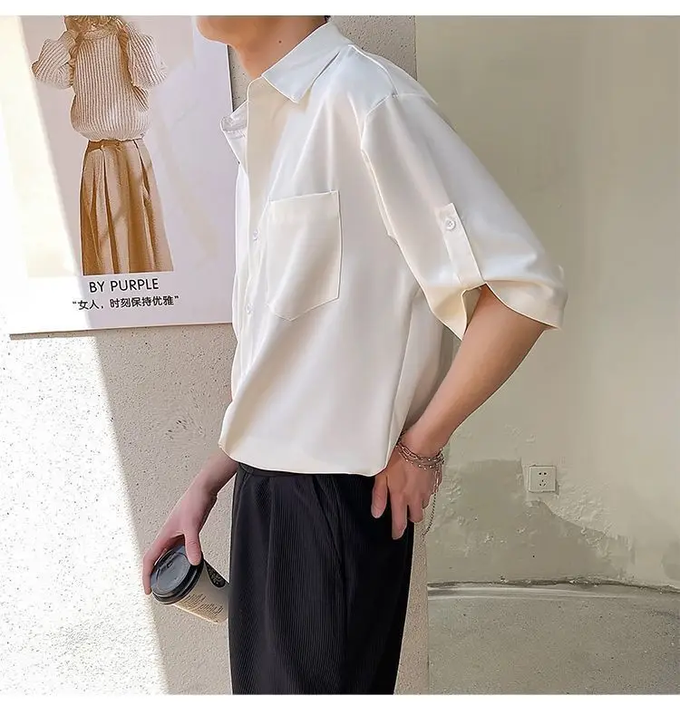 Threebooy Simple Korean Short Sleeved Men Summer Solid White Shirt Lapel Button Pocket Harajuku Fashion Trendy Loose Casual Thin Male Top
