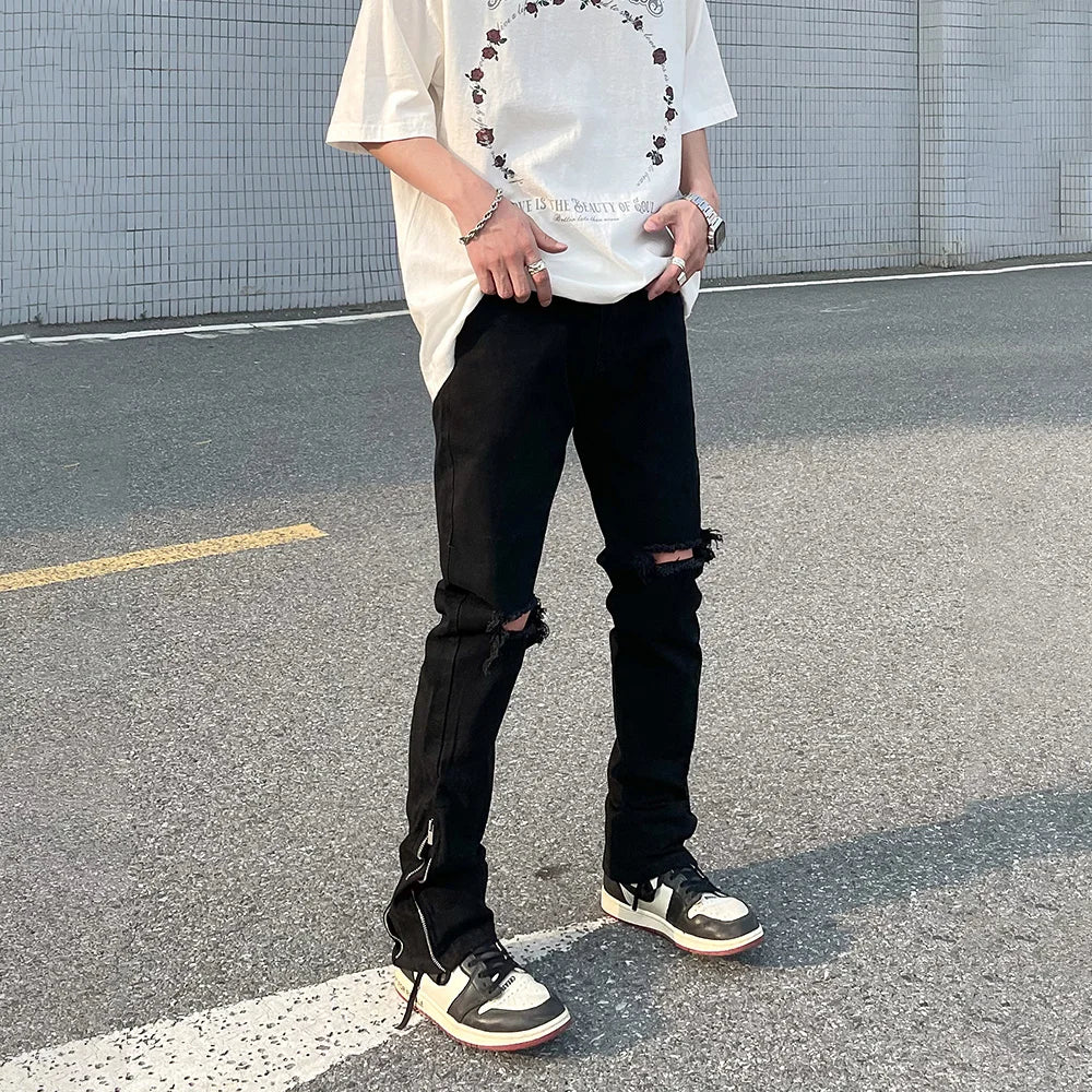 Threebooy Skinny Jeans Men Y2k Streetwear Ripped Vaqueros Trousers Casual Slim Autumn Black Zip Pantalones Summer Street Hole Denim Pants