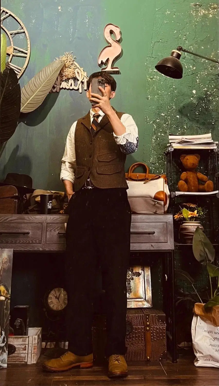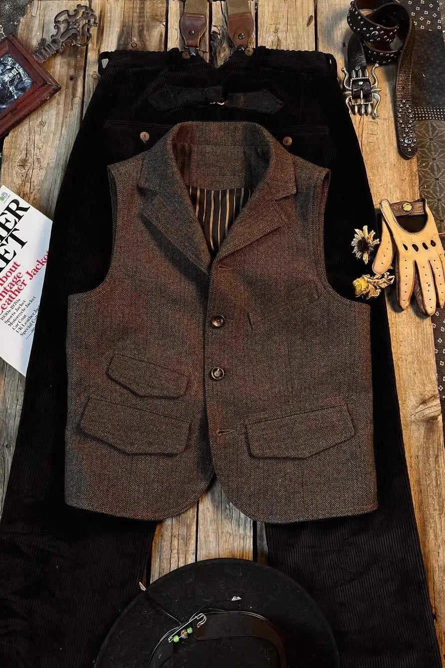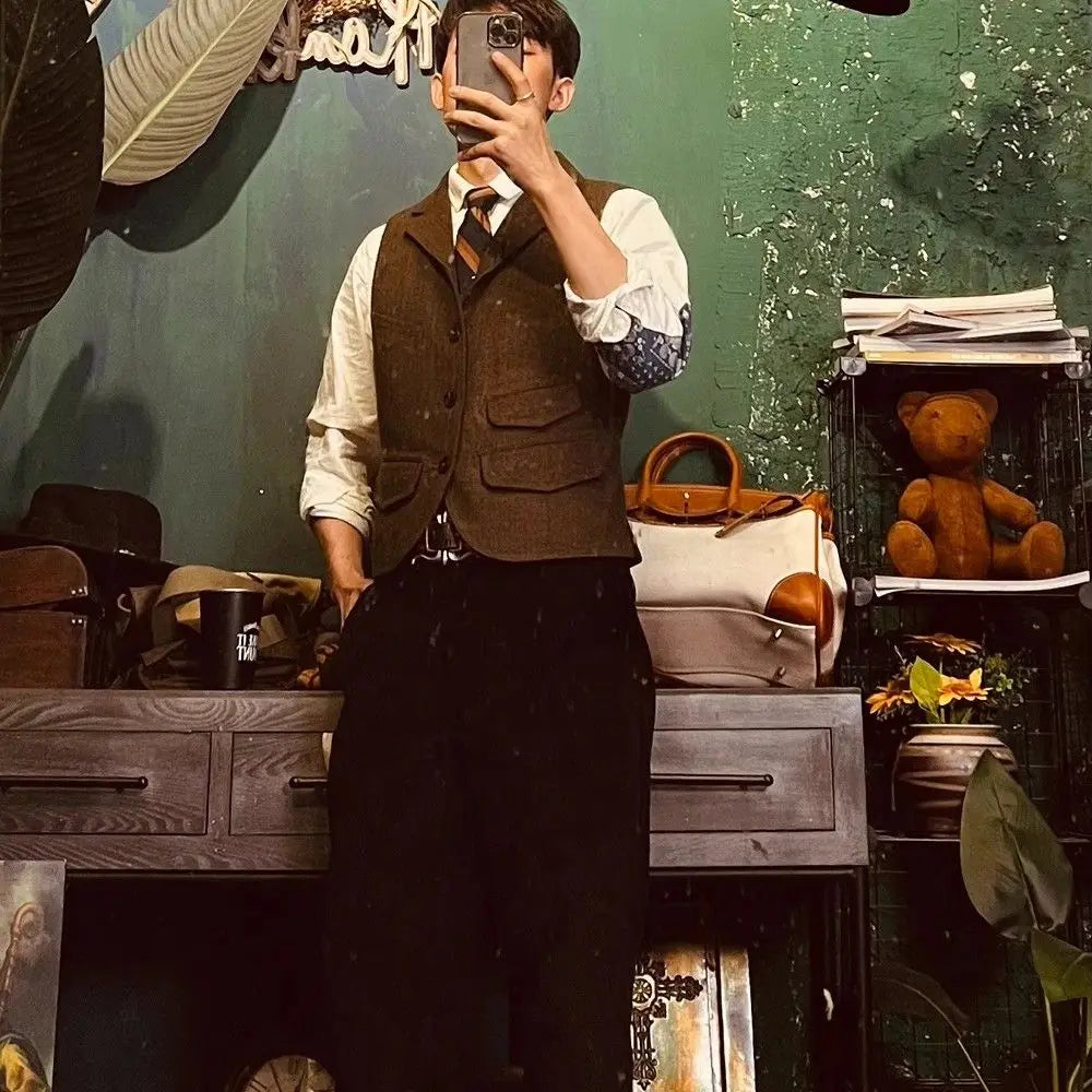 Threebooy Spring British Retro Wool Herringbone Vest French Fashion Elegant Style Tweed Vest Wool Khaki Suit Slim Vest Aesthetic Elegant