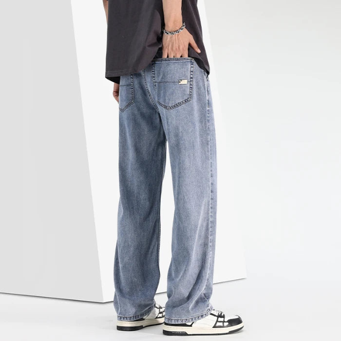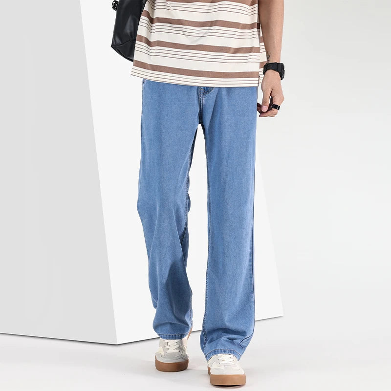 Threebooy Spring/Summer New Ice Silk Loose Denim Fashionable Sports Casual Pants for Men, Loose and Droopy Wide-Leg Pants