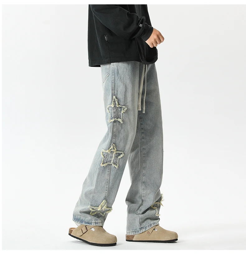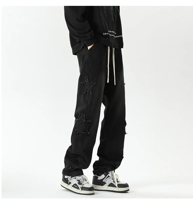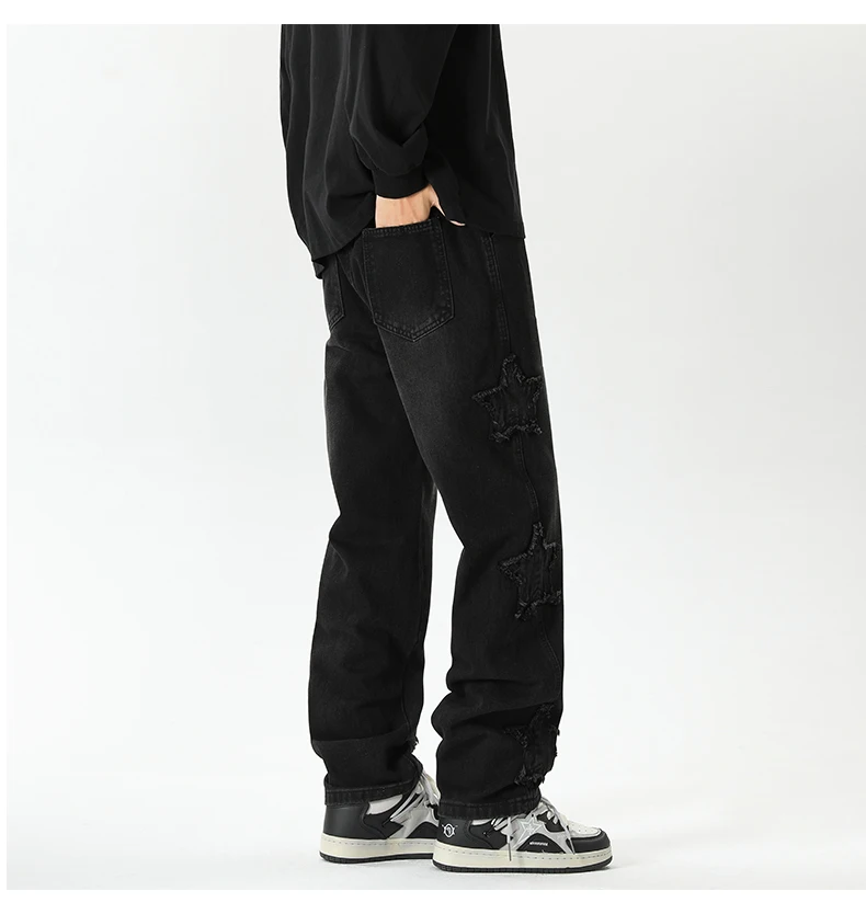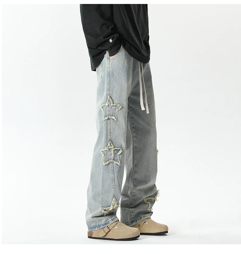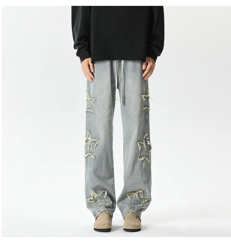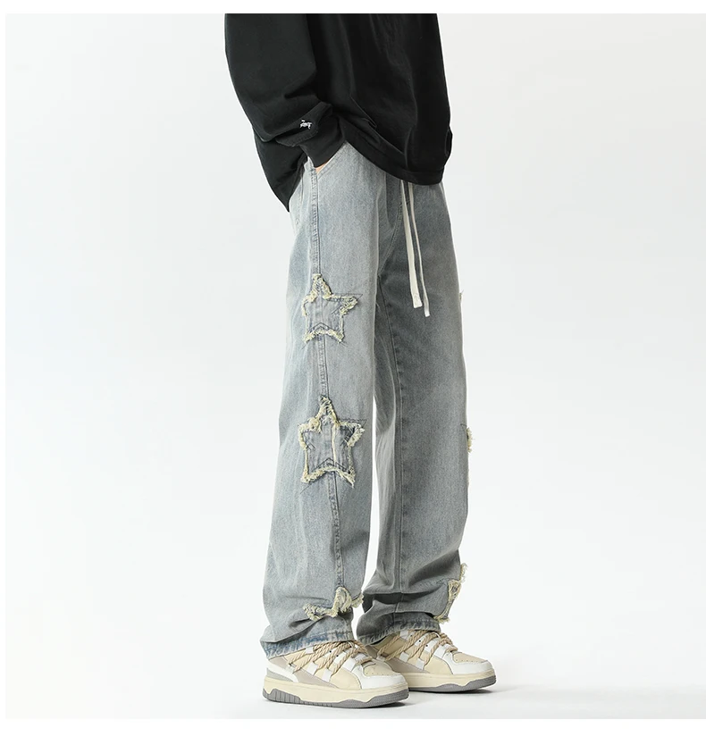 Threebooy Star Embroidered Men's Jeans Baggy Straight Elastic Waist Denim Pants Fashion High Street Hip Hop Streetwear Y2K Male Trousers