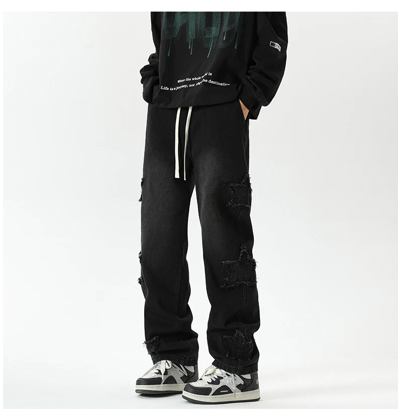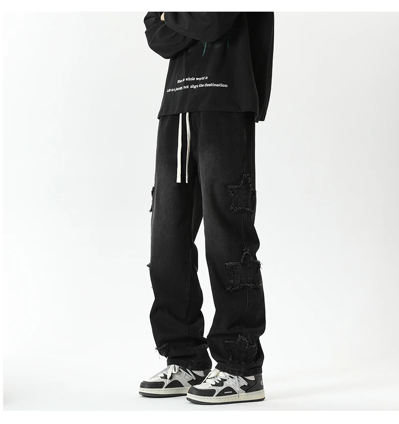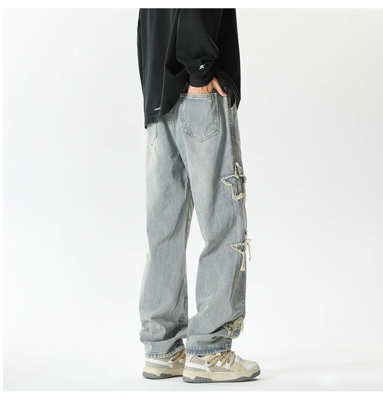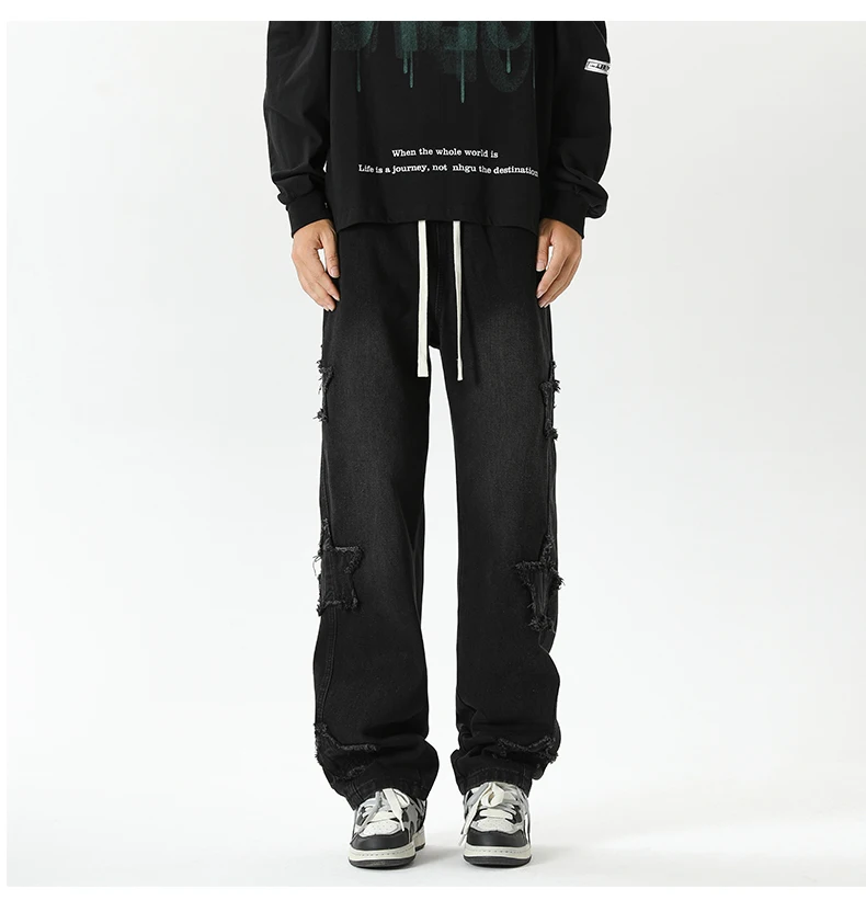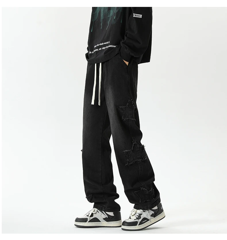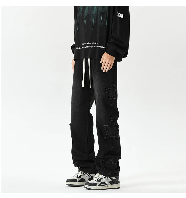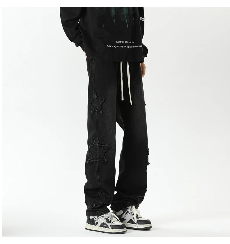 Threebooy Star Embroidered Men's Jeans Baggy Straight Elastic Waist Denim Pants Fashion High Street Hip Hop Streetwear Y2K Male Trousers