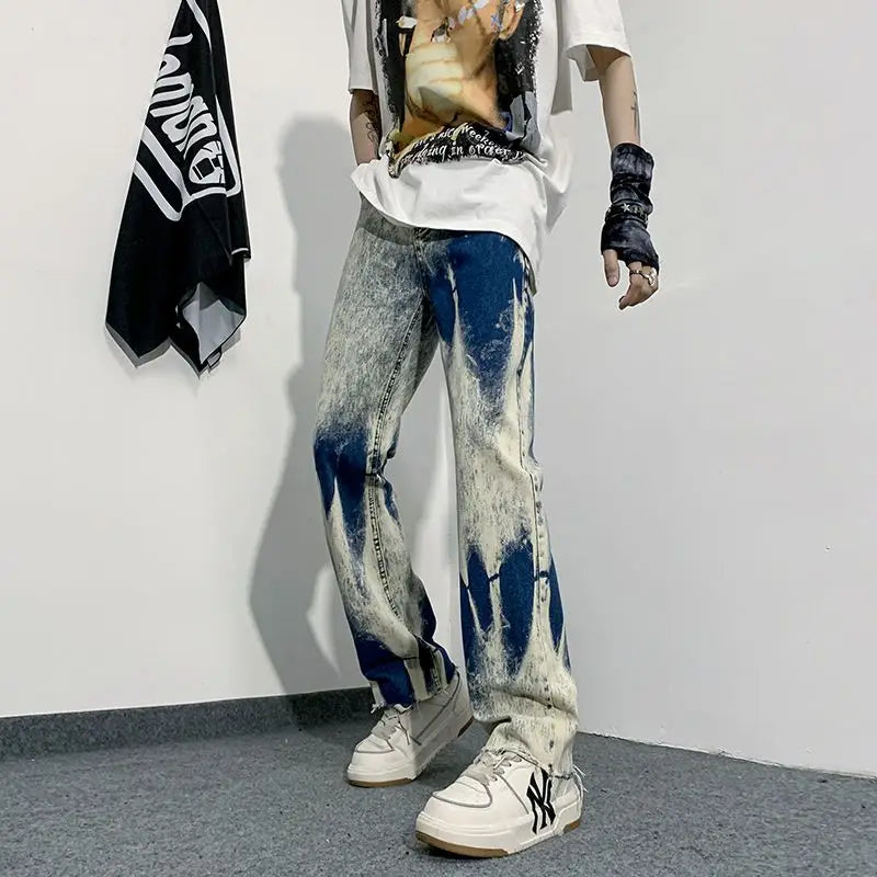 Threebooy Street Trendy Asymmetric Tie Die Gradient Design Sense High End Slim Narrow Edition Jeans Zipper Button Pockets Straight Pants