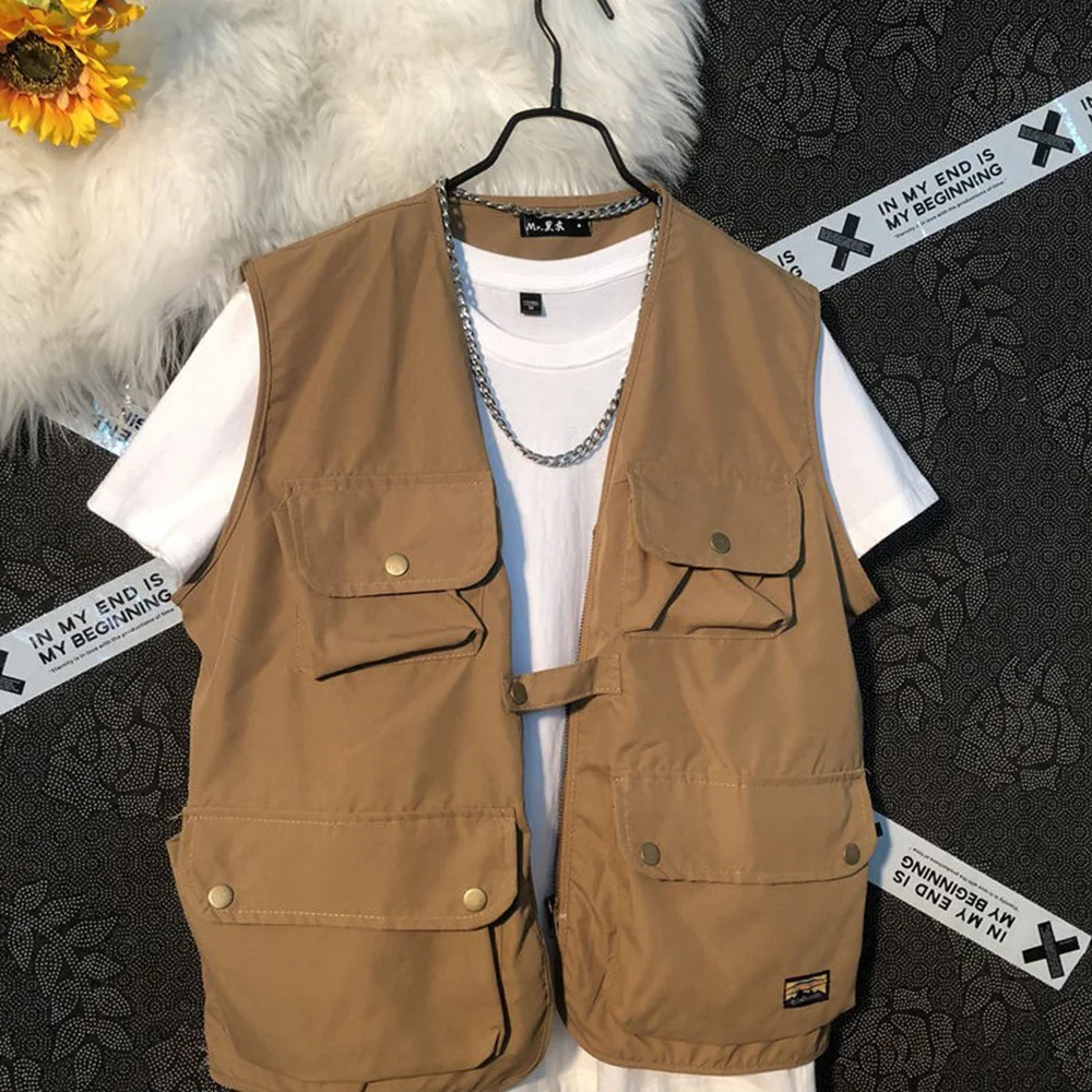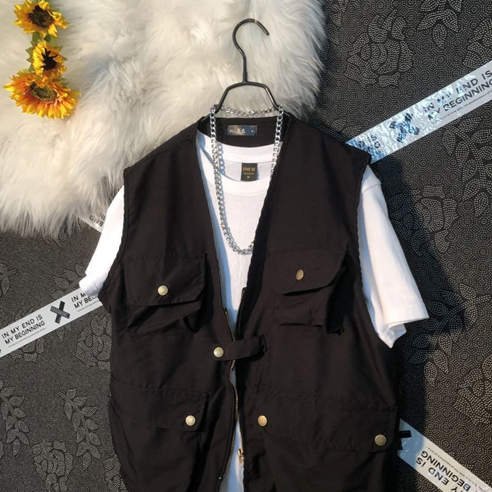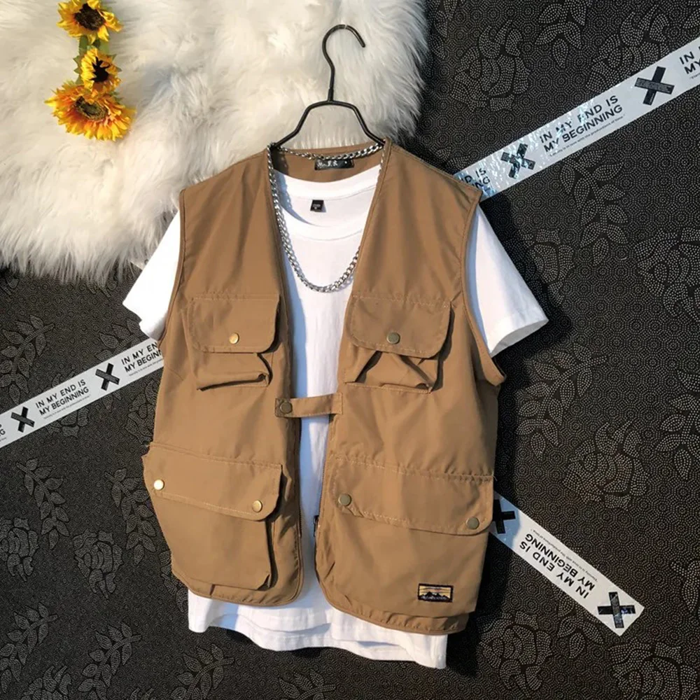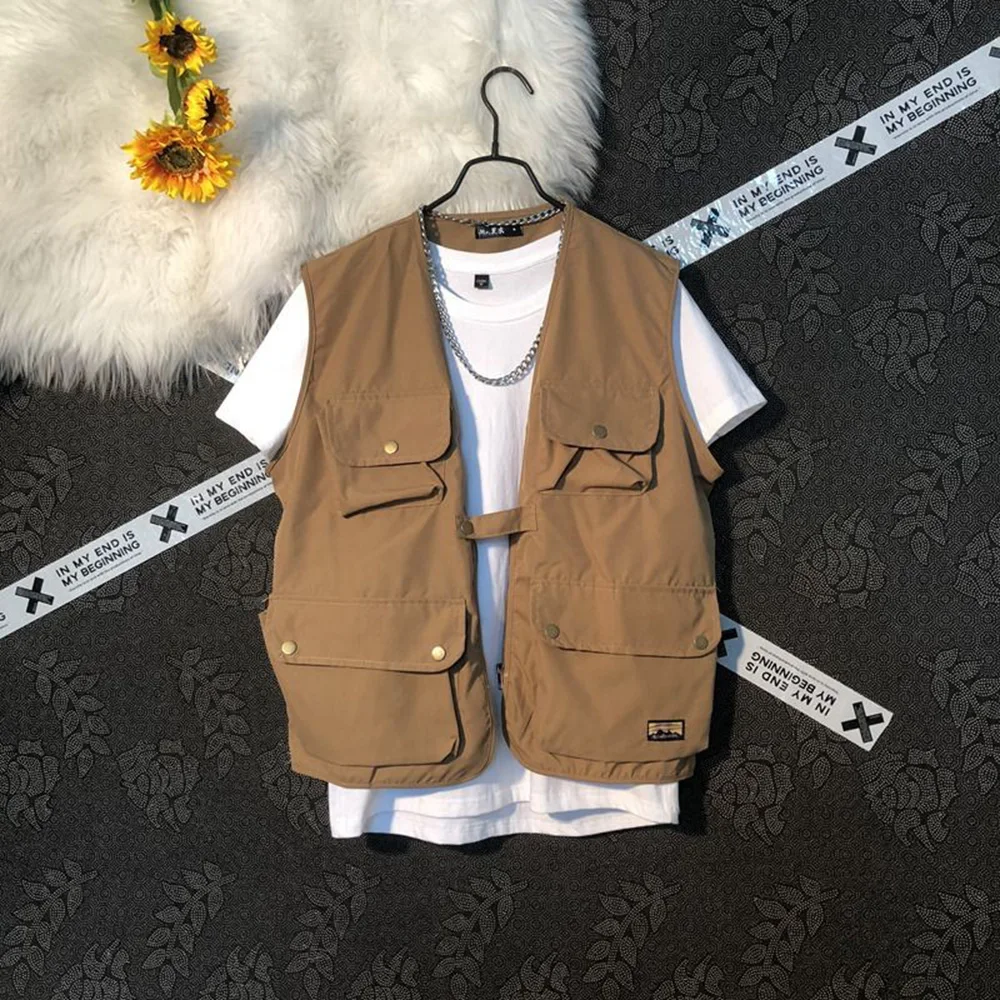 Threebooy Summer New Men's Cargo Sleeveless Solid Color Vest Multi-Pocket American Retro Fashion Casual Trend Street Loose Men's Tops