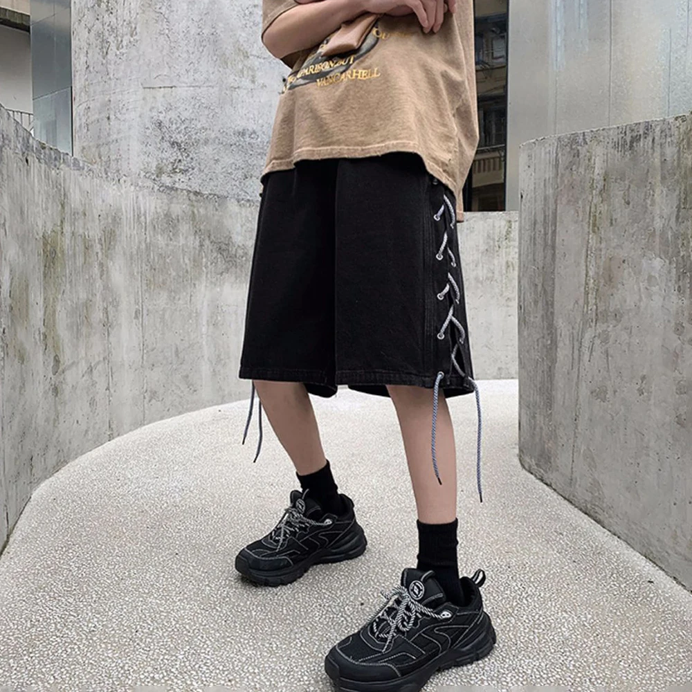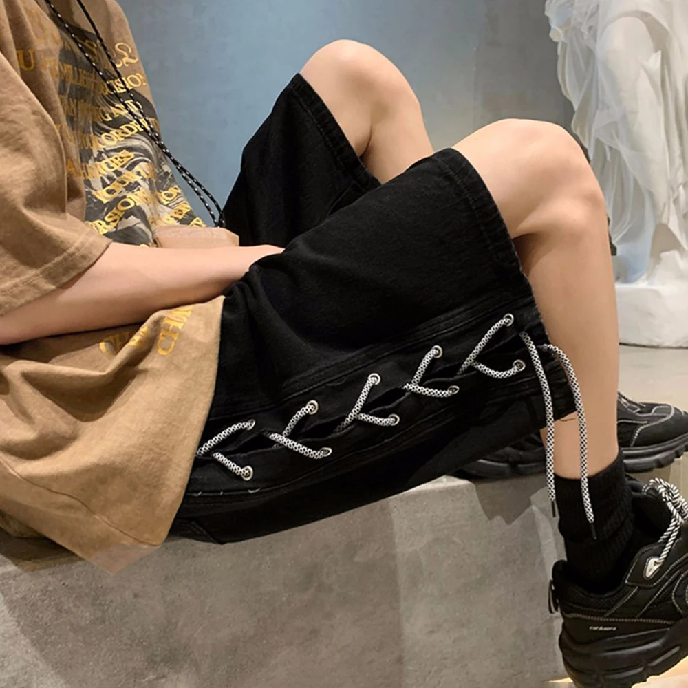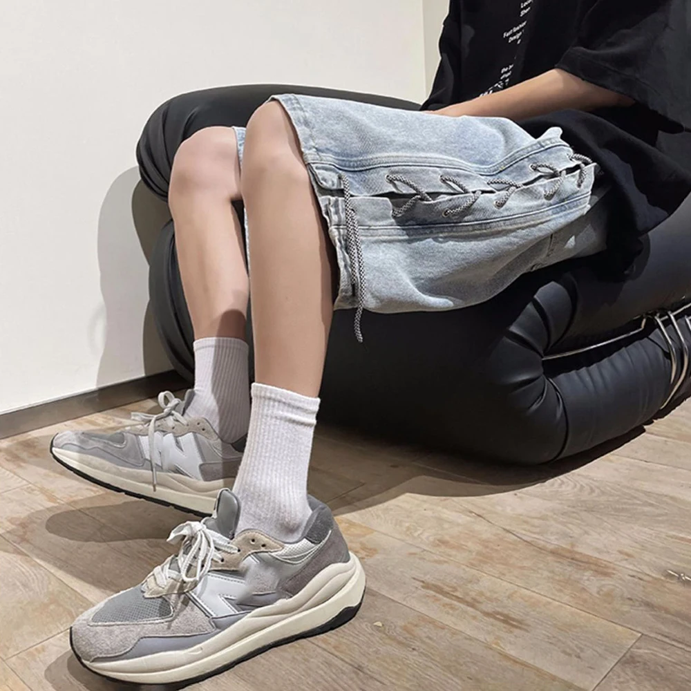 Threebooy Summer New Webbing Denim Shorts Men's Niche Loose Trendy Brand Retro Jeans Thin Casual Five-Point Pants Y2K Streetwear Fashionab