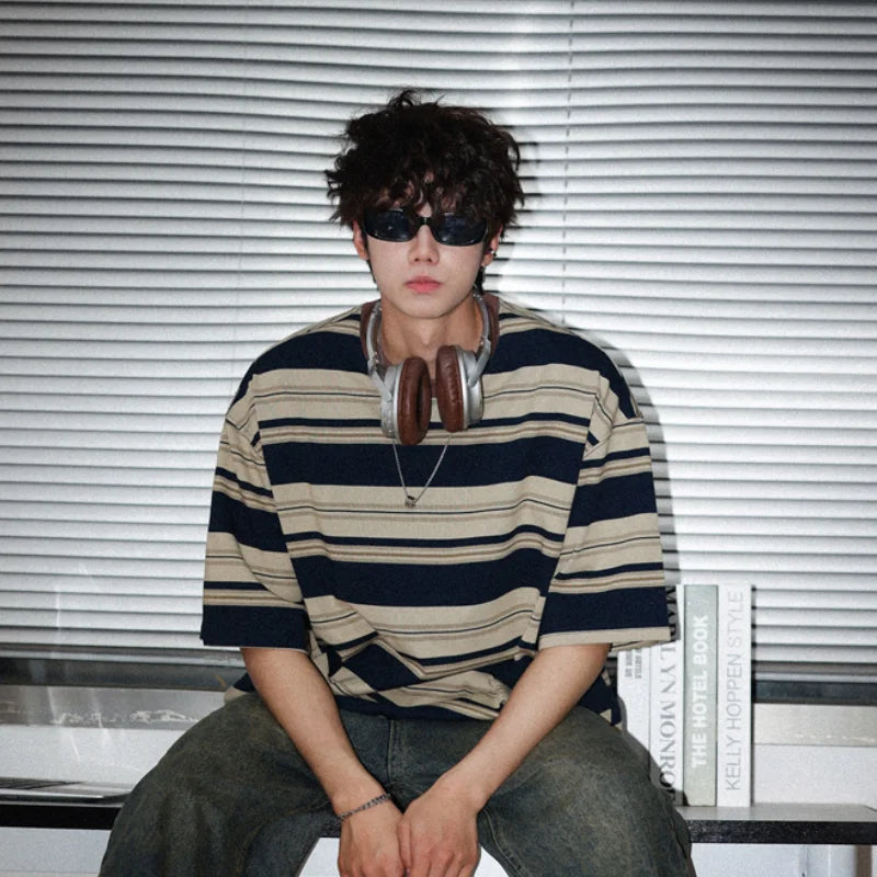 Threebooy Summer T-shirts Contrast Color American Style Couple Half Sleeve High Street Harajuku Baggy Youthful Popular Striped Clothing