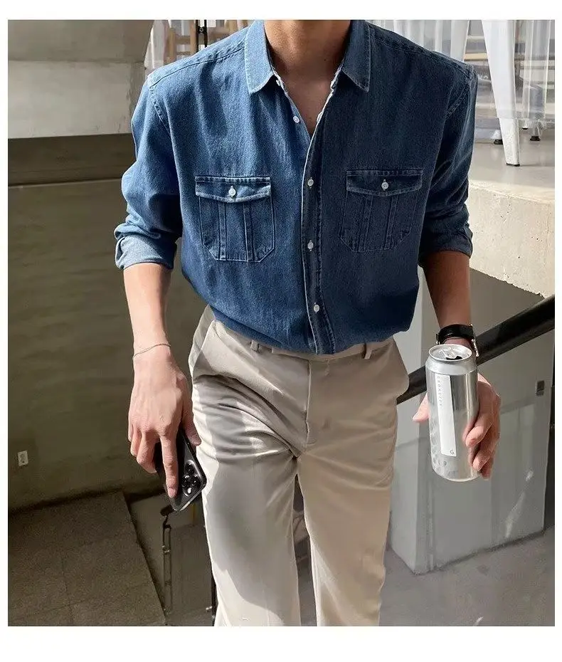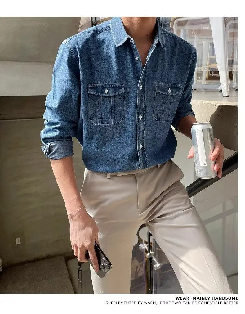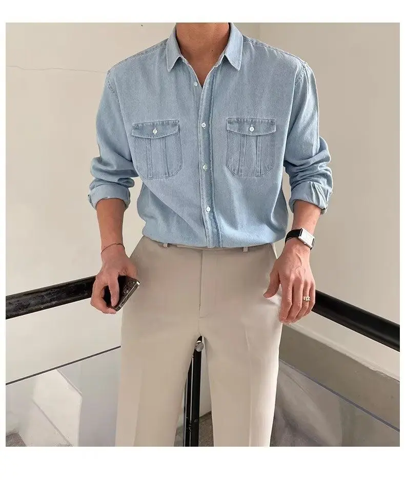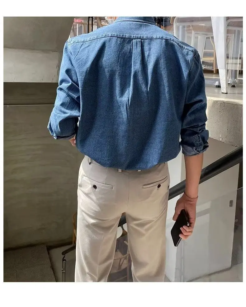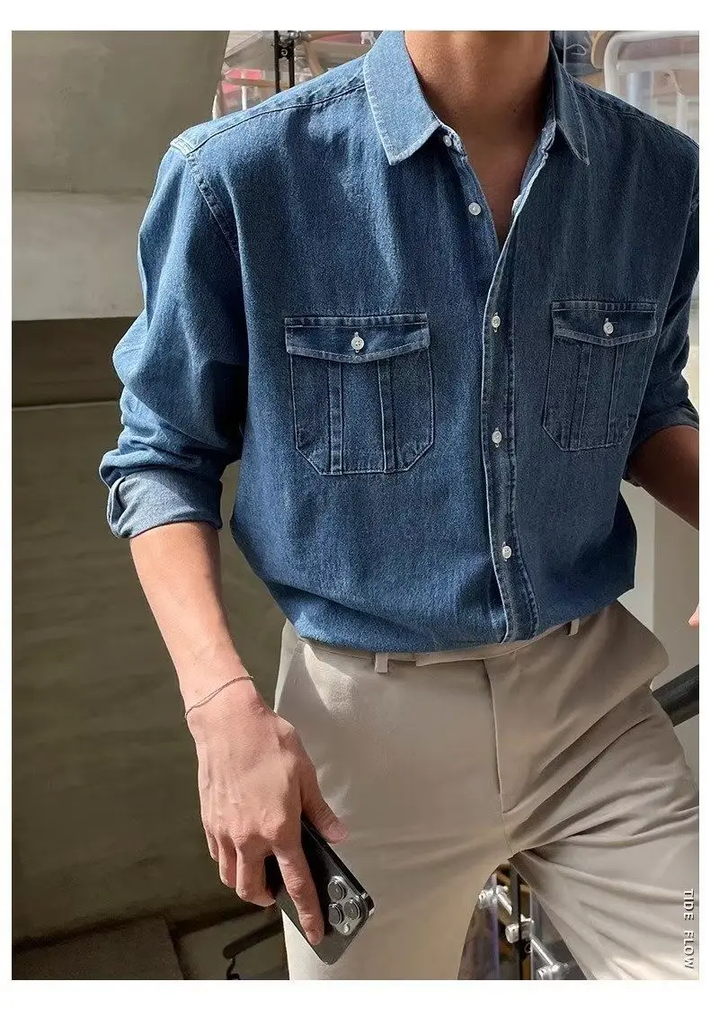 Threebooy Summer Washing and Old Denim Shirt Men's Spring Korean Style Loose High-end Long-sleeved Work Shirt