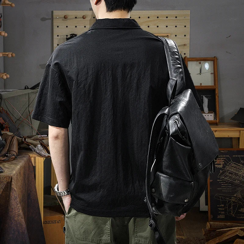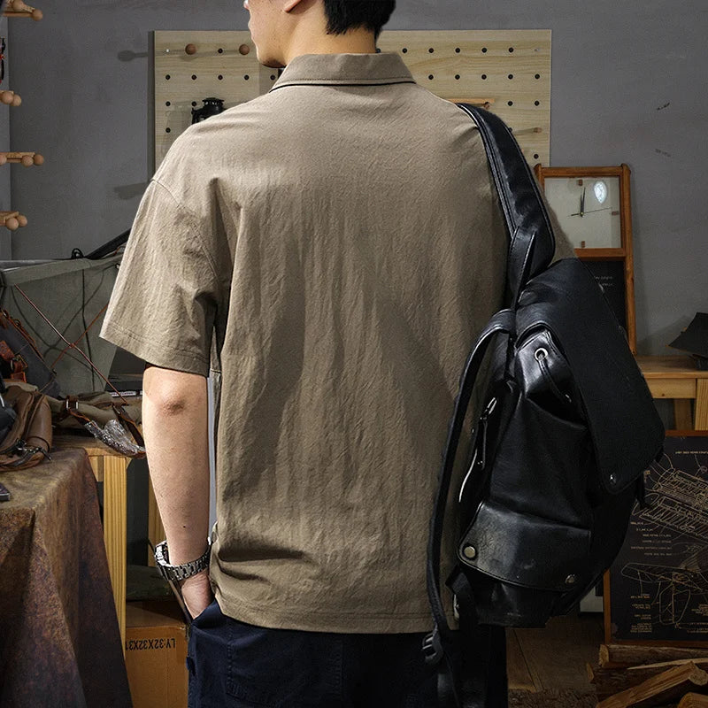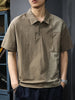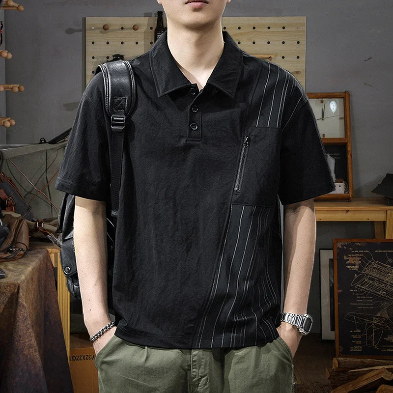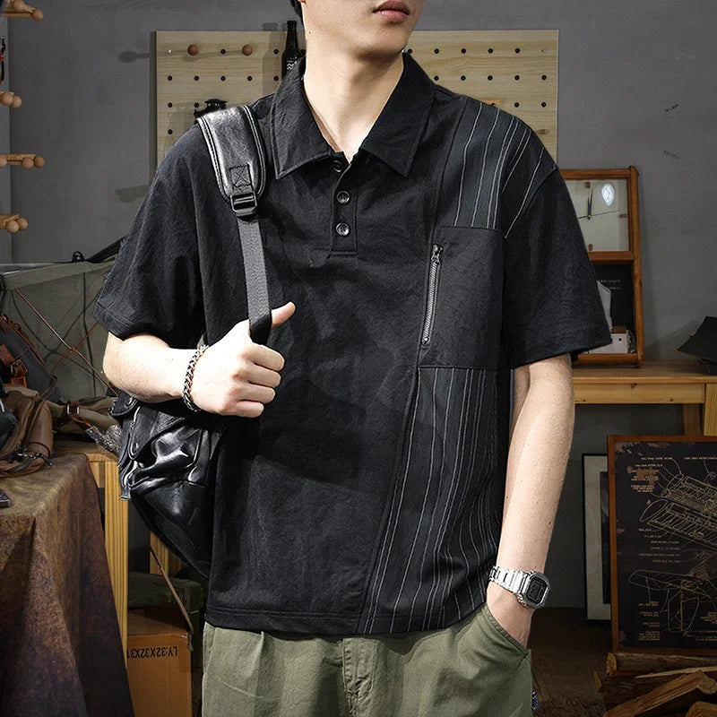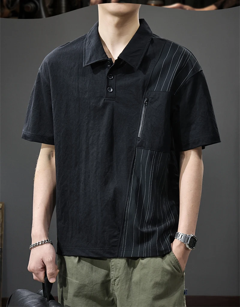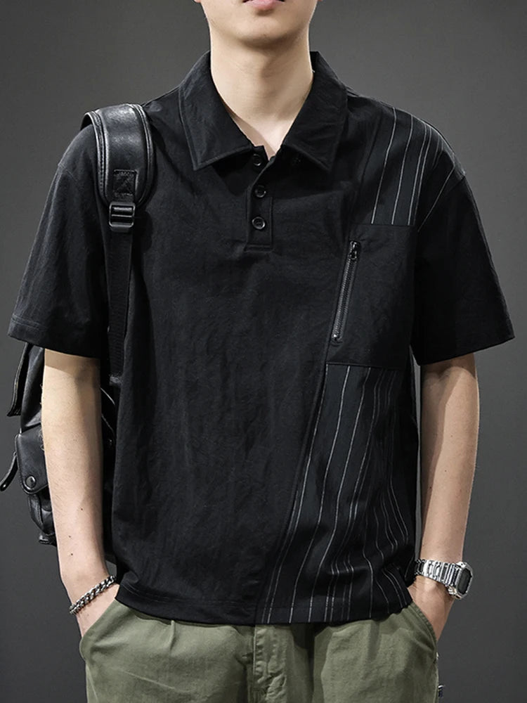 Threebooy Summer Zip Pockets Short Sleeve Polo Shirts Men's Striped Patchwork Turn-down Collar T-shirts High Street Y2K Polos Tee Tops