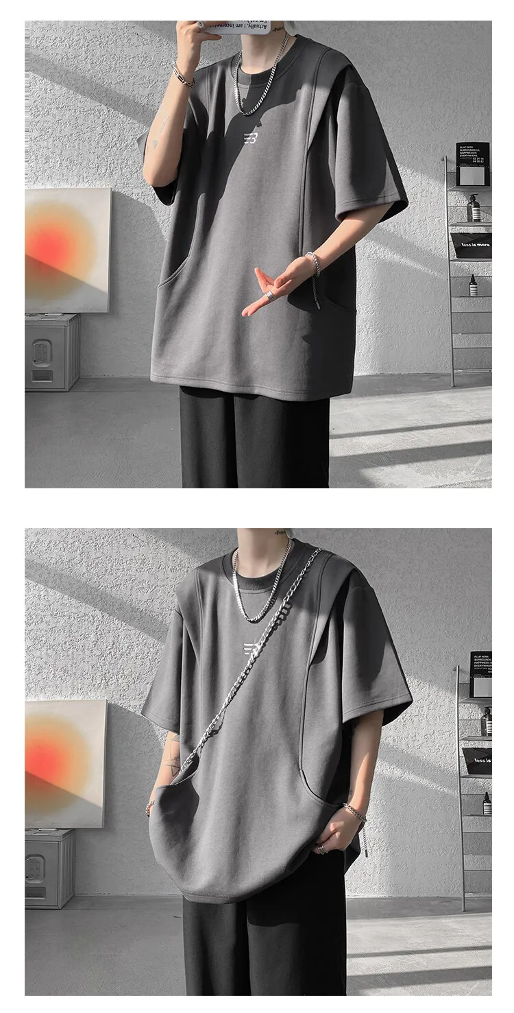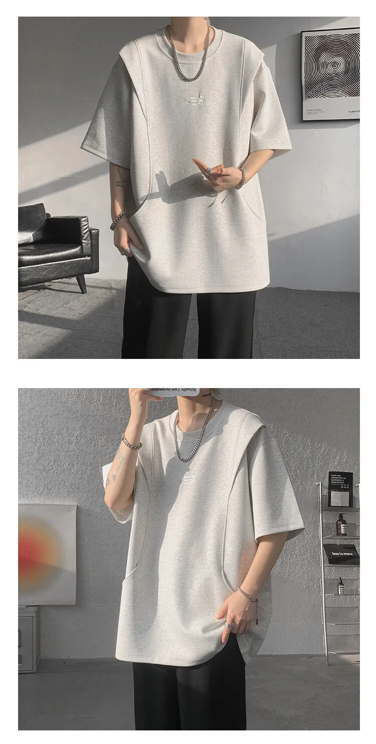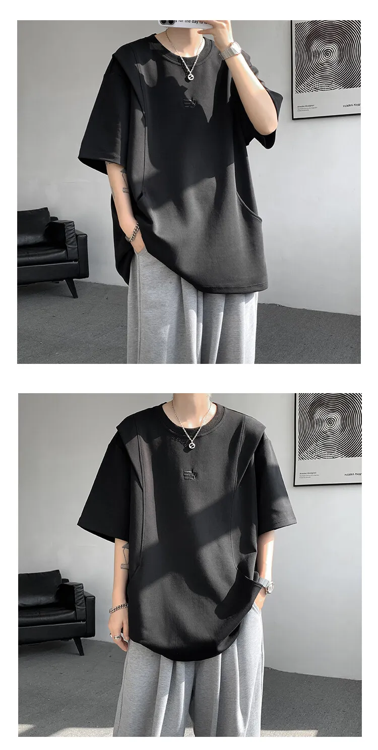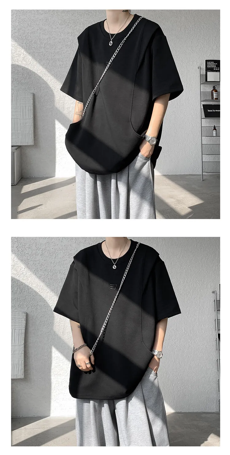 Threebooy t shirt Men Loose Fit Crew Neck T-Shirt Solid Streetwear Urban Casual Patchwork Design Trendy Hip Hop Tee man 2024 Fashion